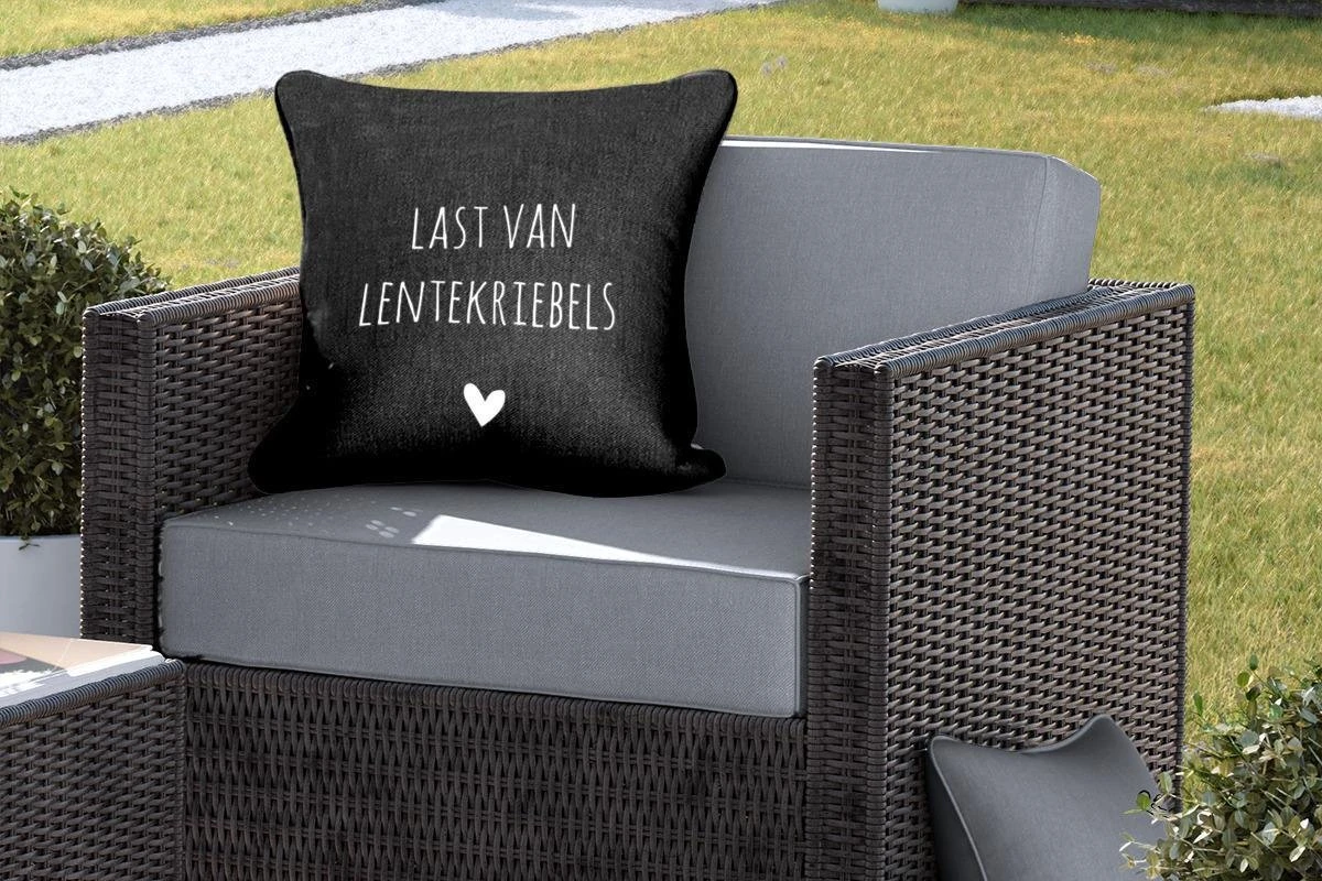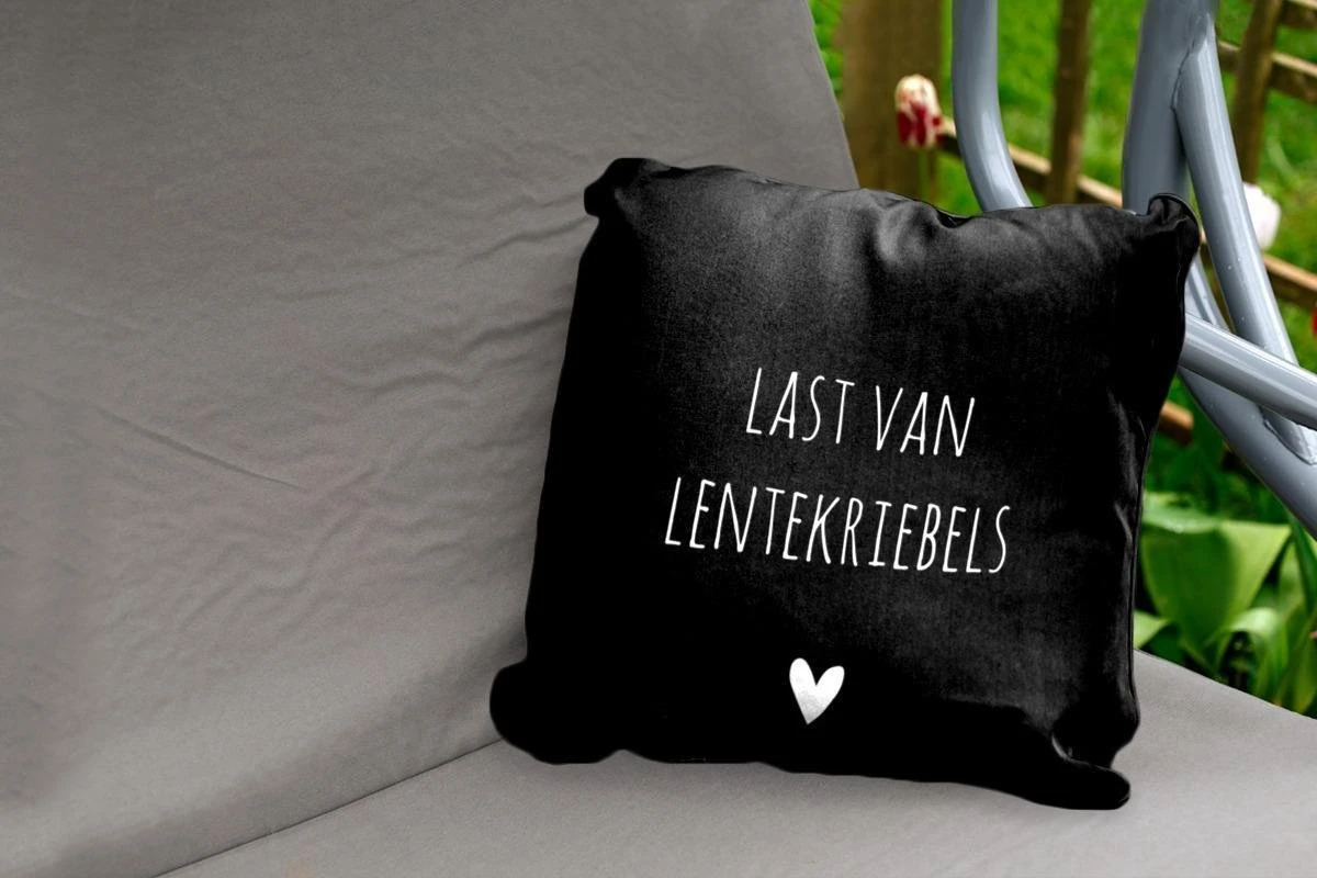Nederlandse spreuk ”Last van lentekriebels” met een zwarte achtergrond.