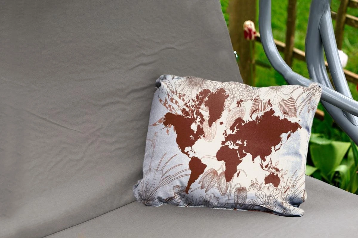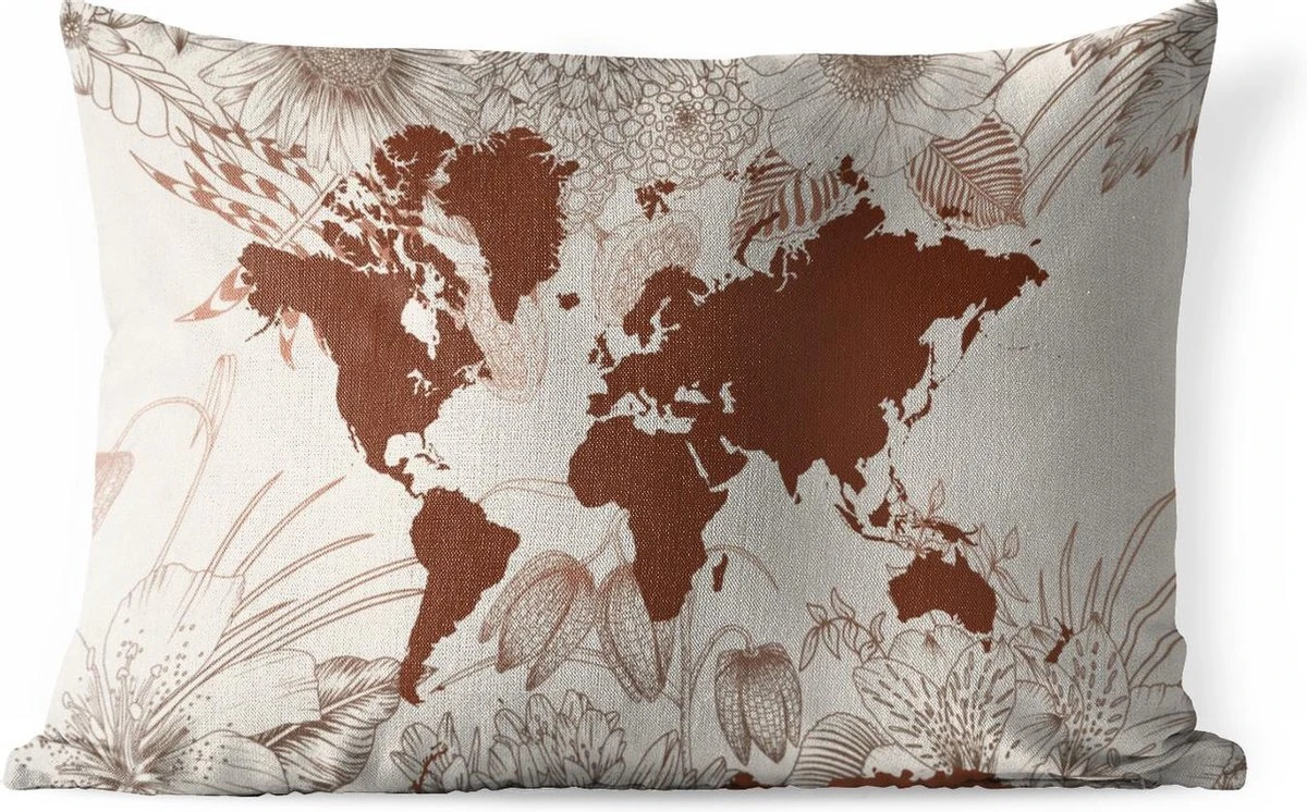 Een donkerrode wereldkaart staat op een rozige achtergrond. De achtergrond is versierd met illustraties van verschillende bloemen. Deze afbeelding past perfect in de woonkamer.
