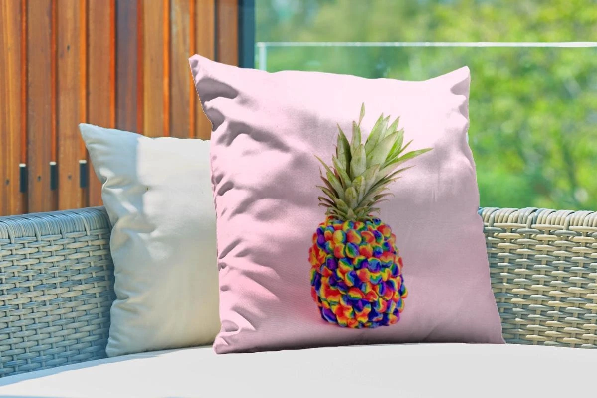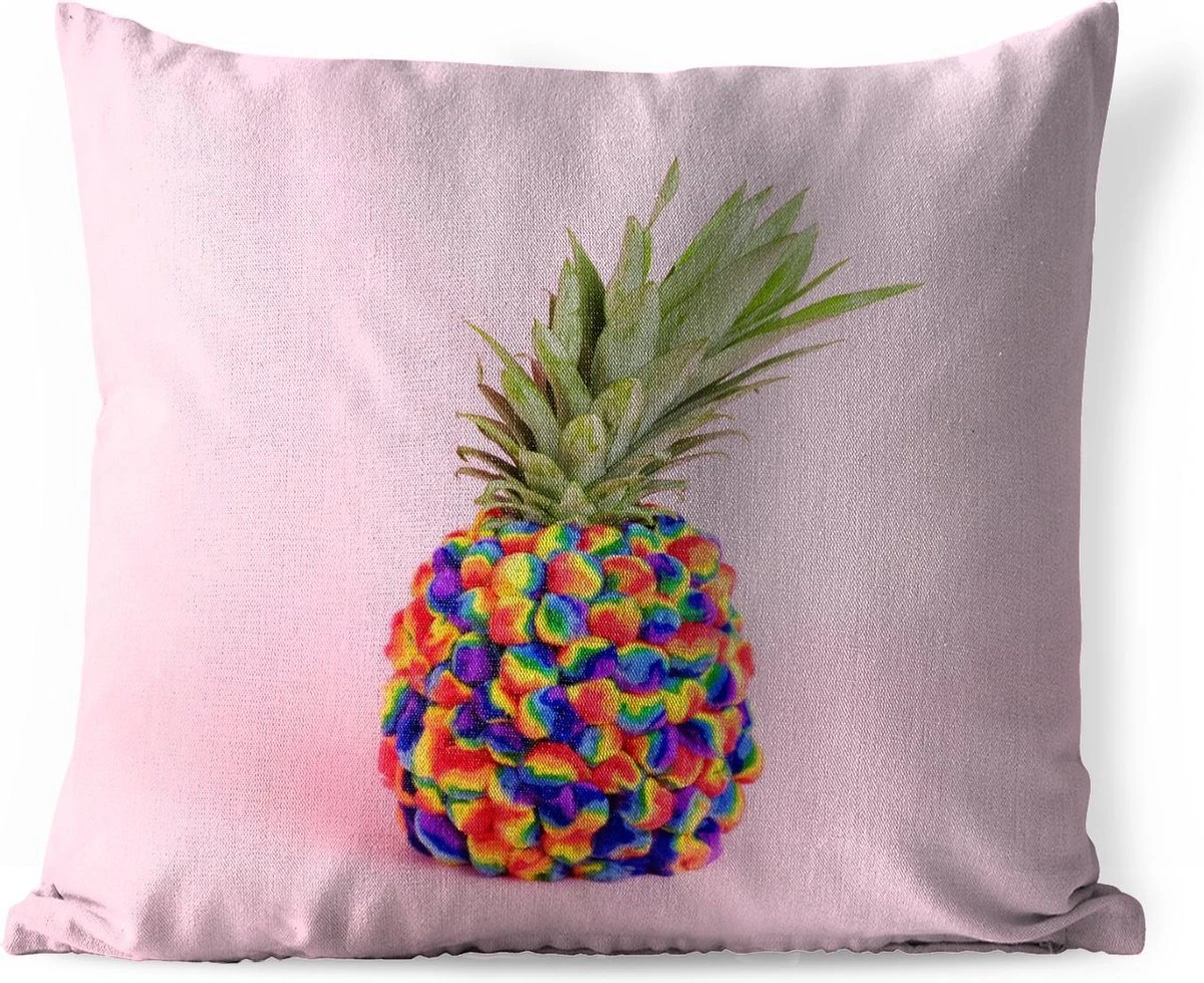 Er is helemaal niks meer te zien van de schil van de ananas. De schil is helemaal bedekt met vrolijk gekleurde balletjes. De vrucht staat afgebeeld tegen een lichtroze achtergrond. Verrijk het interieur van je keuken met deze afbeelding.