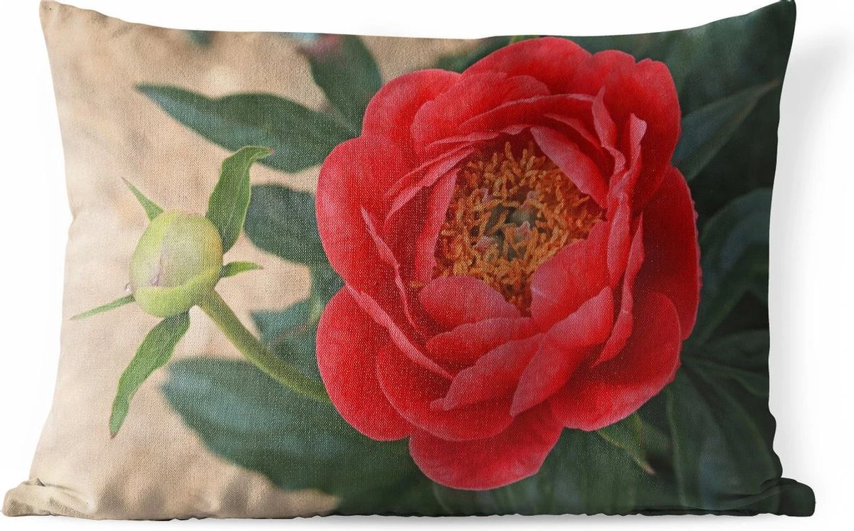 Deze indrukwekkende foto laat een rode pioenroos op haar hoogtepunt zien naast een bloeiende knop van dezelfde bloem. De bloem is goed zichtbaar tegen zijn groene bladeren.