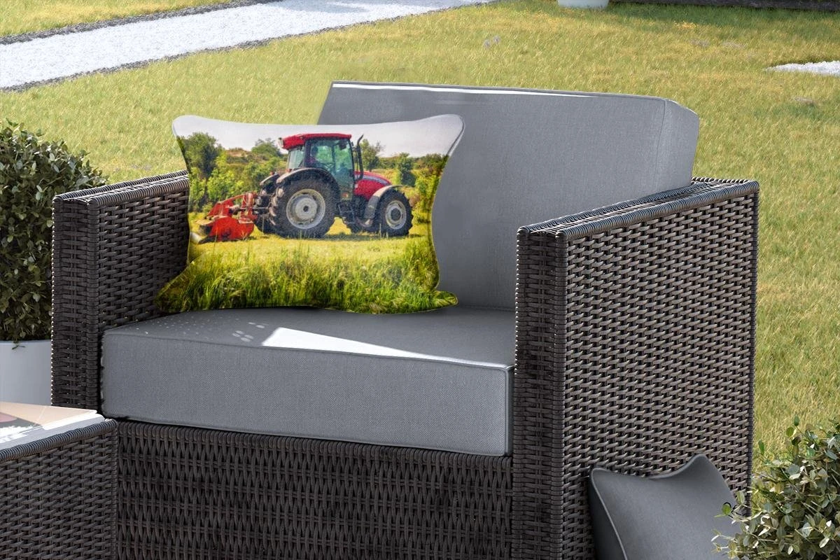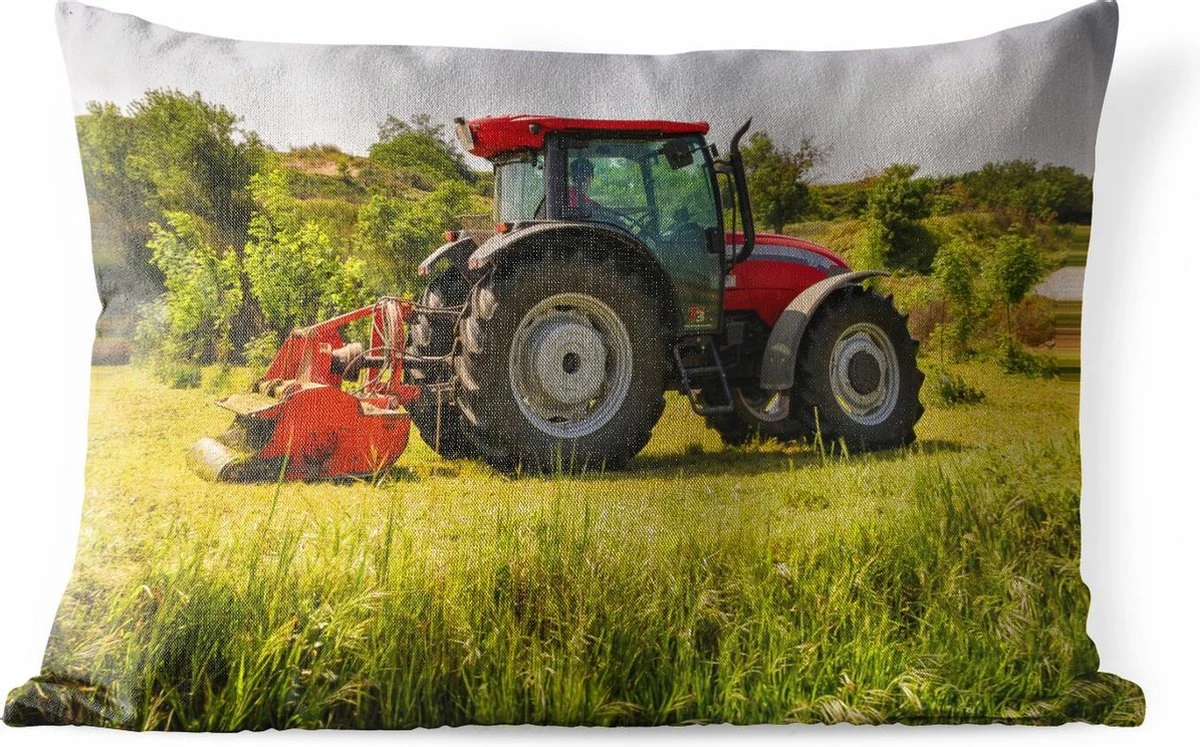 Een rode trekker met achter zich een werkvoertuig om boeren werk te verrichten op het land. De rode trekker staat in contrast met het vele groen in de achtergrond