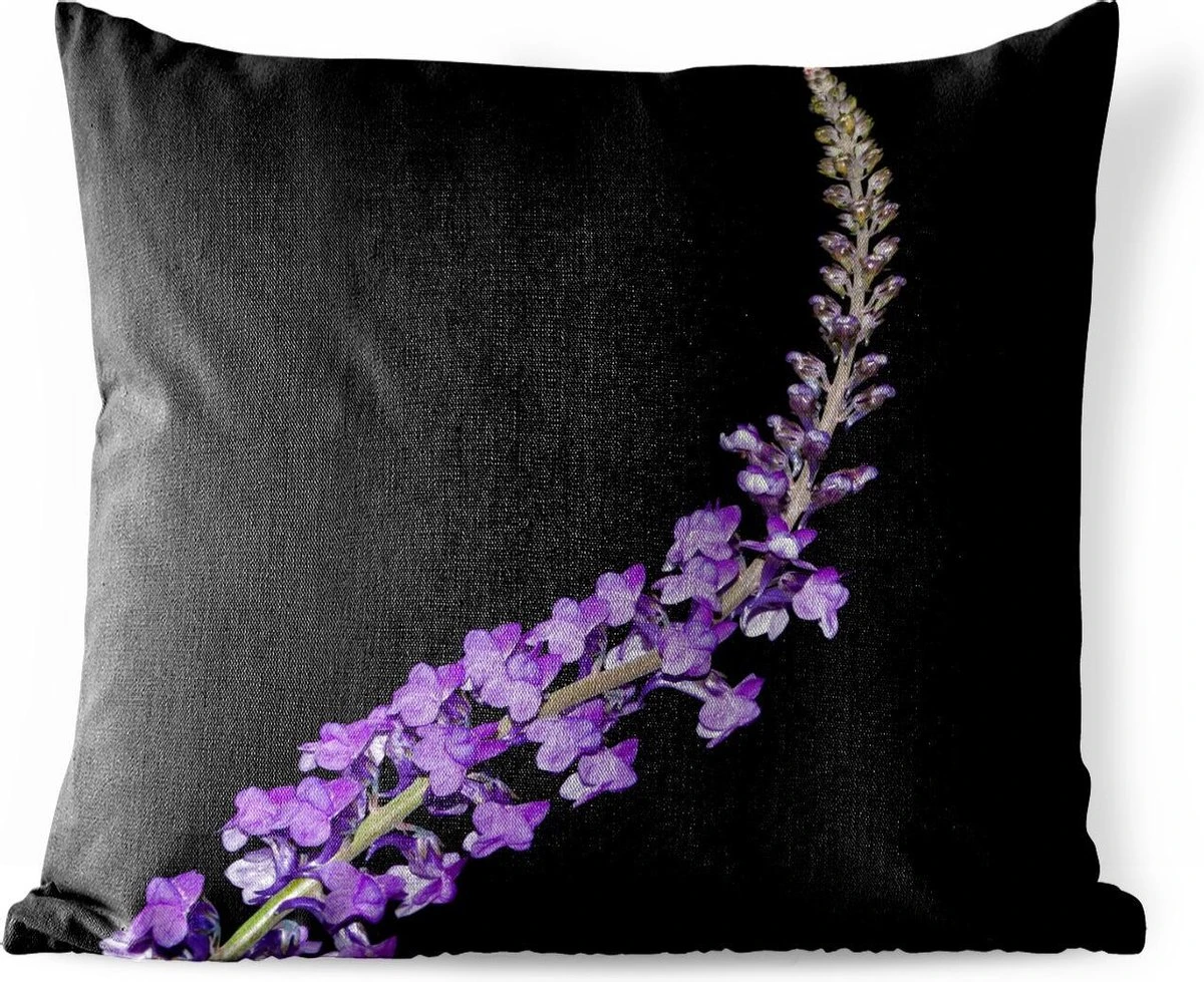 Een lavendelbloem met de bloeiende bladeren op een zwarte achtergrond. Deze plant wordt ook wel gebruikt voor aromatherapie