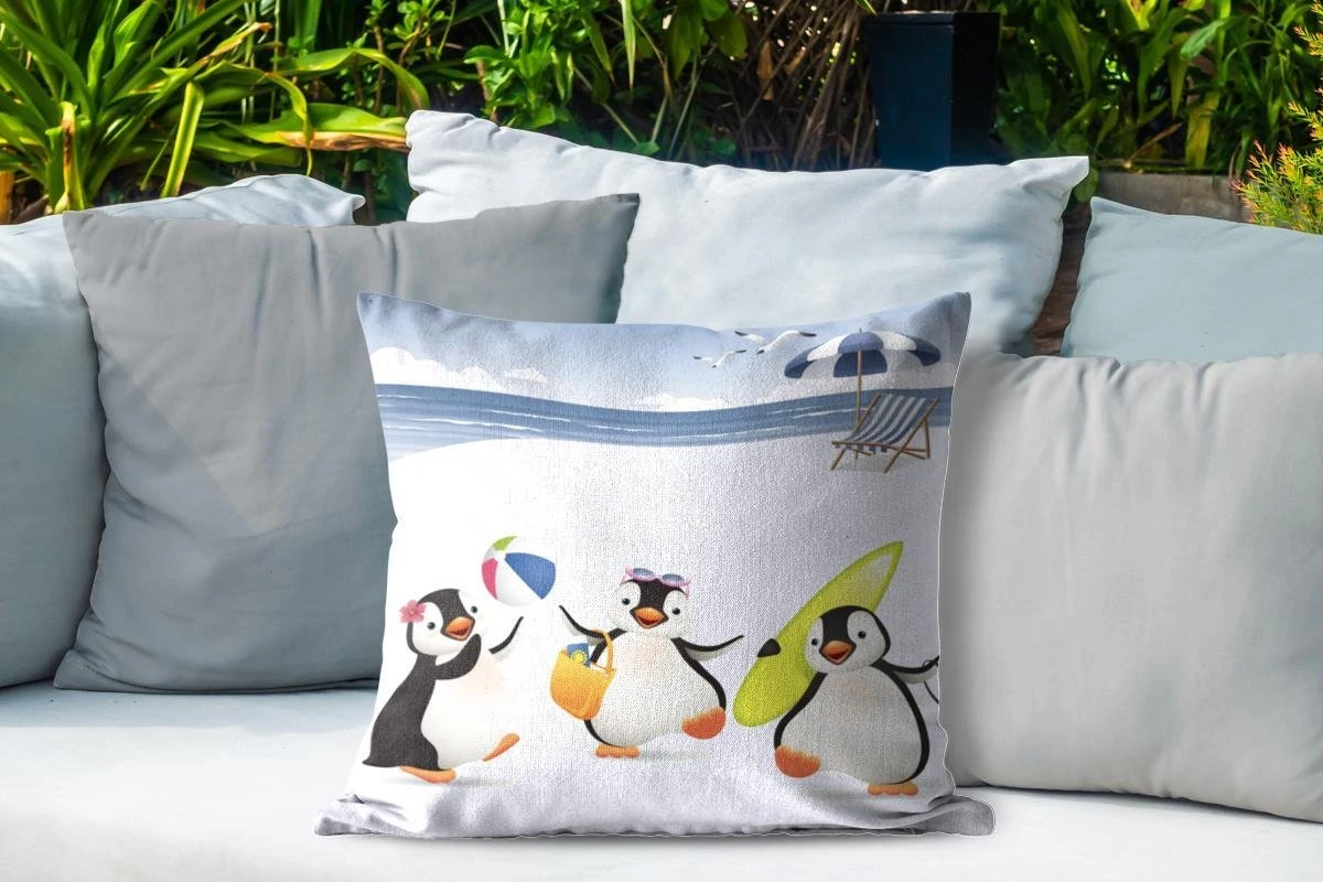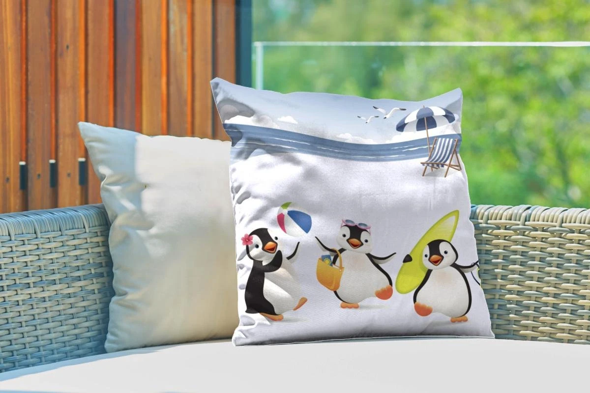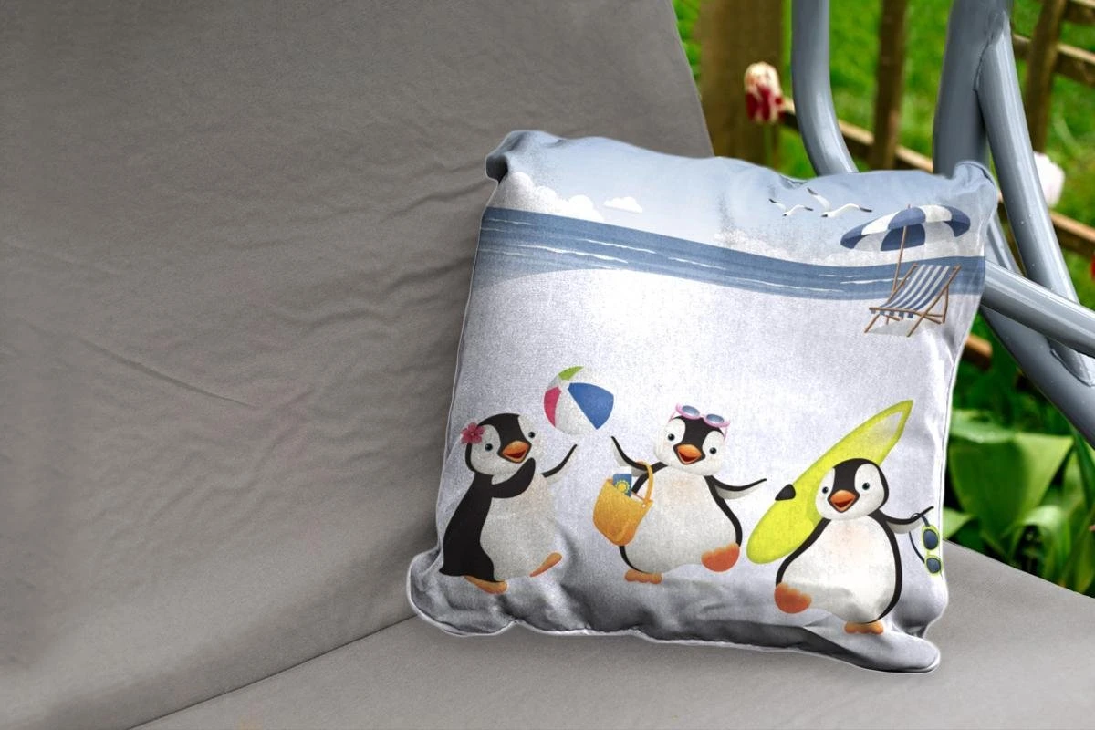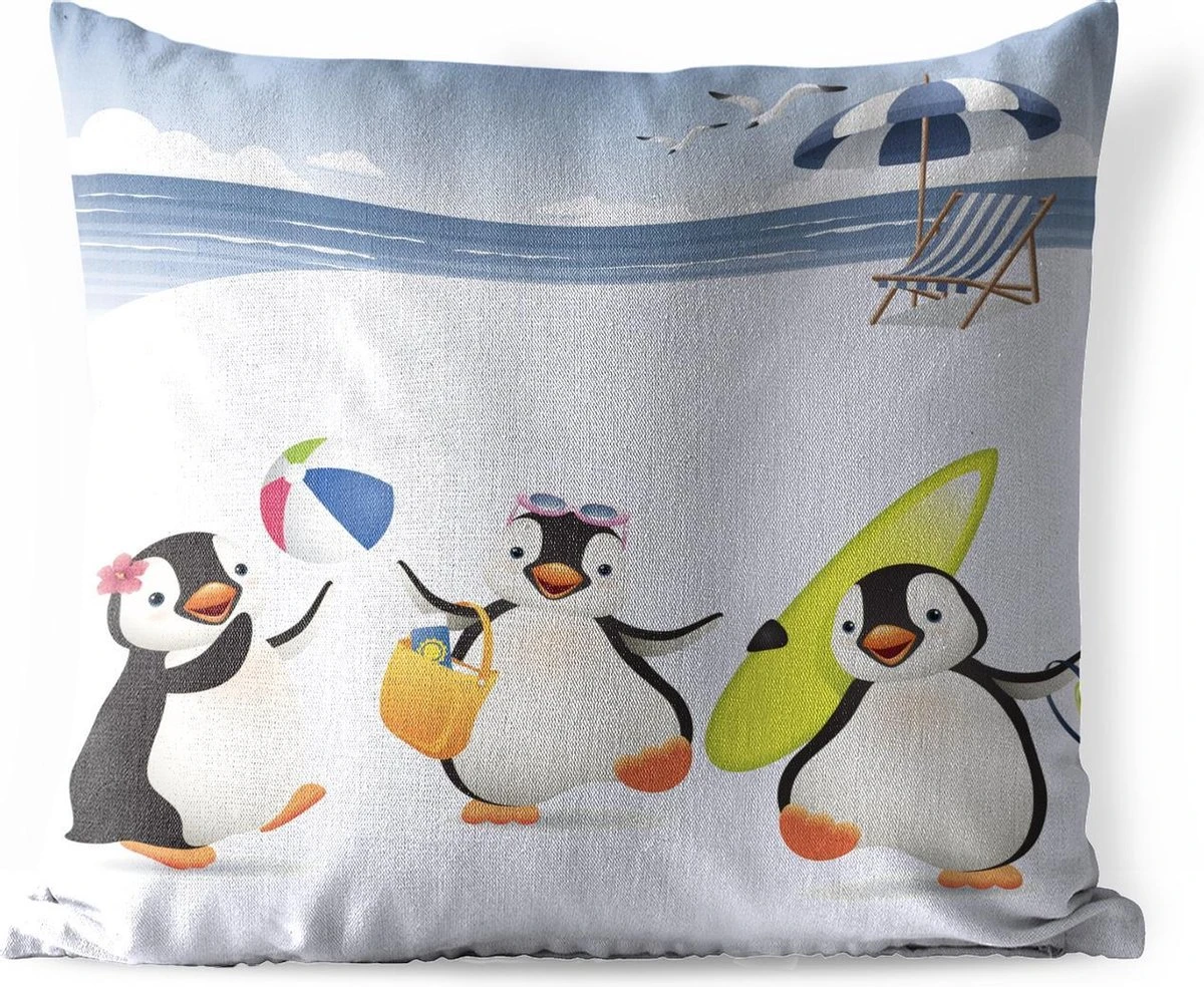 Deze drie jonge pinguïns zijn op het strand aan het spelen. Ze hebben allemaal hun strandattributen bij zich. In de lucht vliegen twee meeuwen. Verrijk het interieur van de speel- of kinderkamer met deze illustratie.