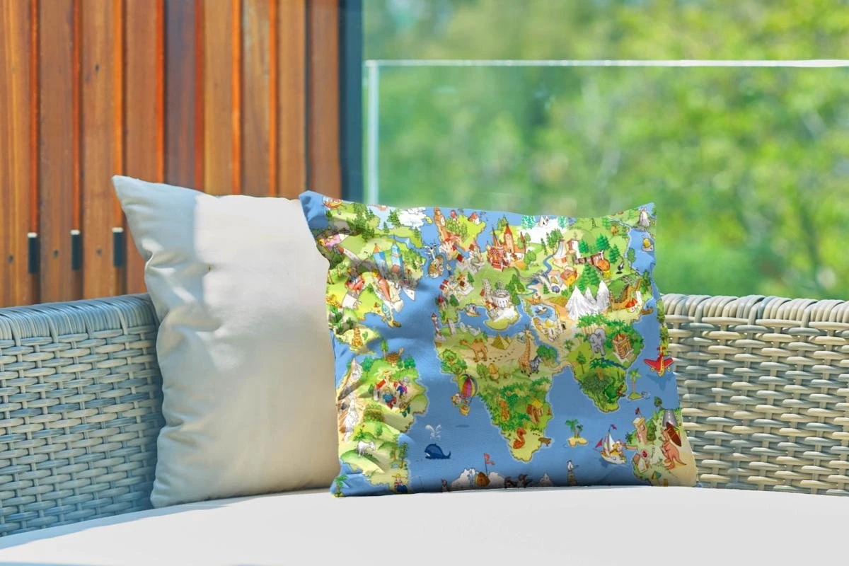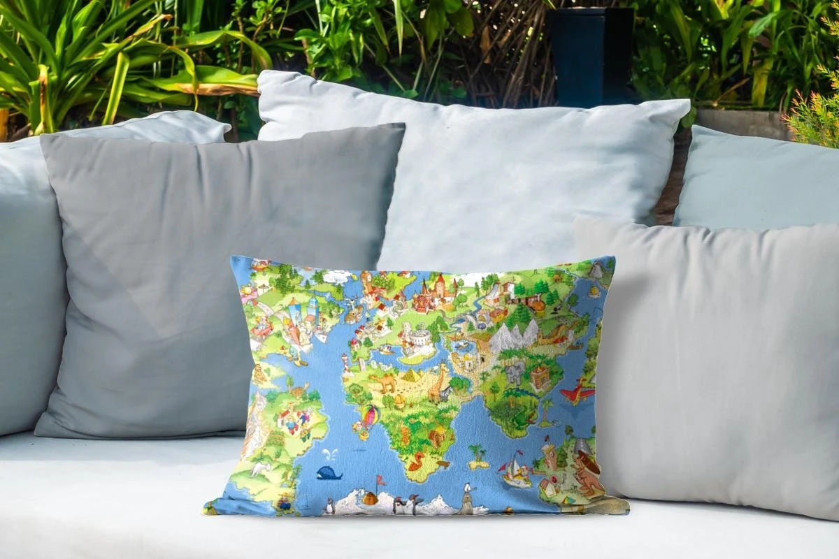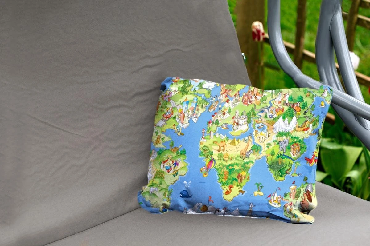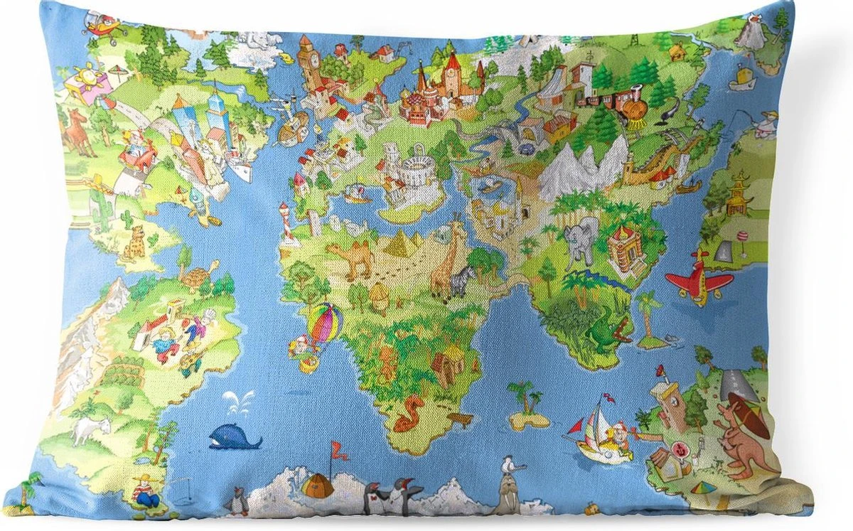 Deze kinder wereldkaart is leuk om naar te kijken en bovendien educatief. Hoe langer je er naar kijkt, des te meer je ontdekt. Op de kaart staan namelijk dieren en gebouwen afgebeeld, waarom een land, regio of stad bekendheid geniet. Te denken valt onder andere aan het Vrijheidsbeeld, de Eiffeltoren, de olifant en de kangoeroe.