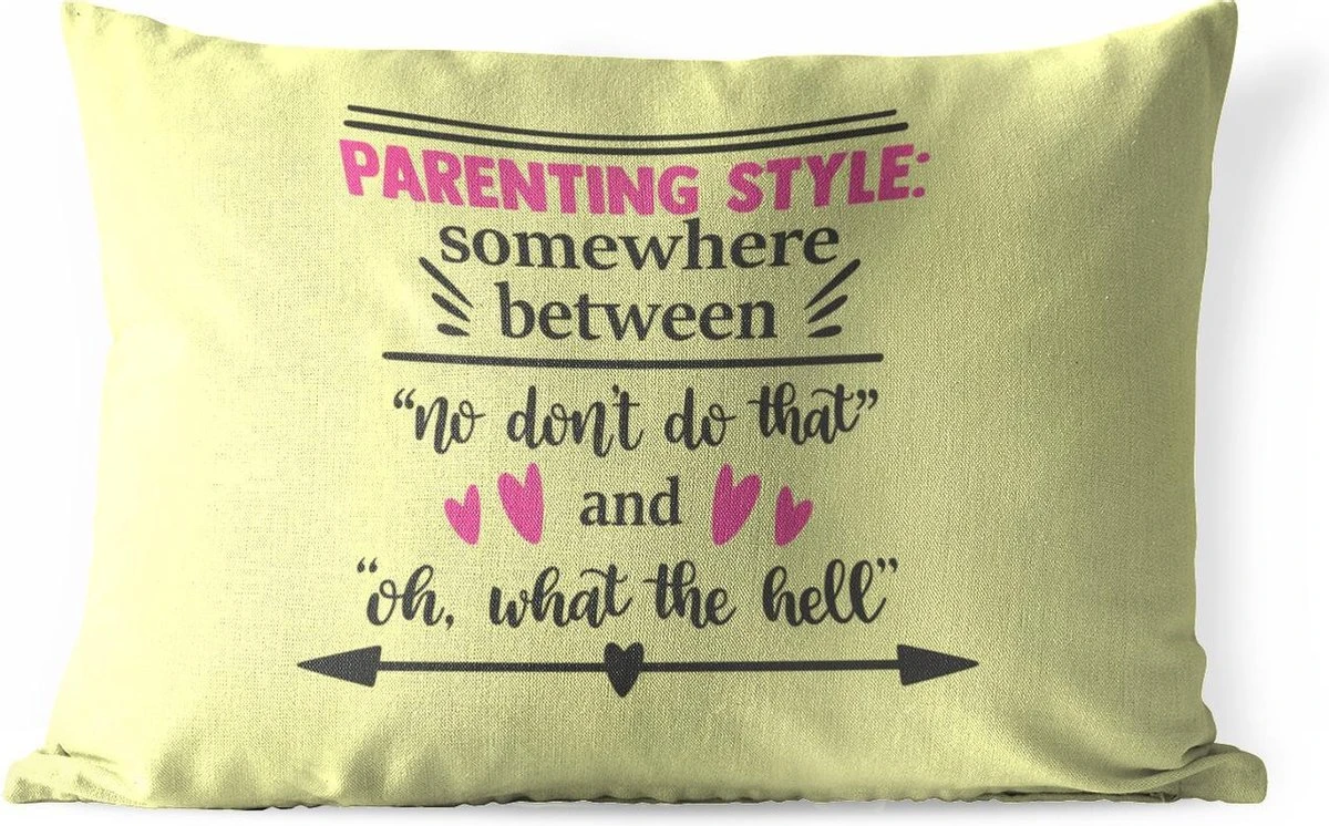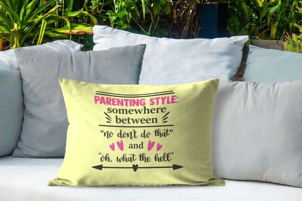 Parenting style: somewhere between No don’t do that and oh, what the hell is een grappige quote die perfect is als cadeau voor Moederdag! Maak je moeder elke dag aan het lachen door deze quote op te hangen in haar slaap- of studeerkamer. De quote staat afgebeeld op een gele achtergrond en is versierd met pijlen, harten en lijnen.