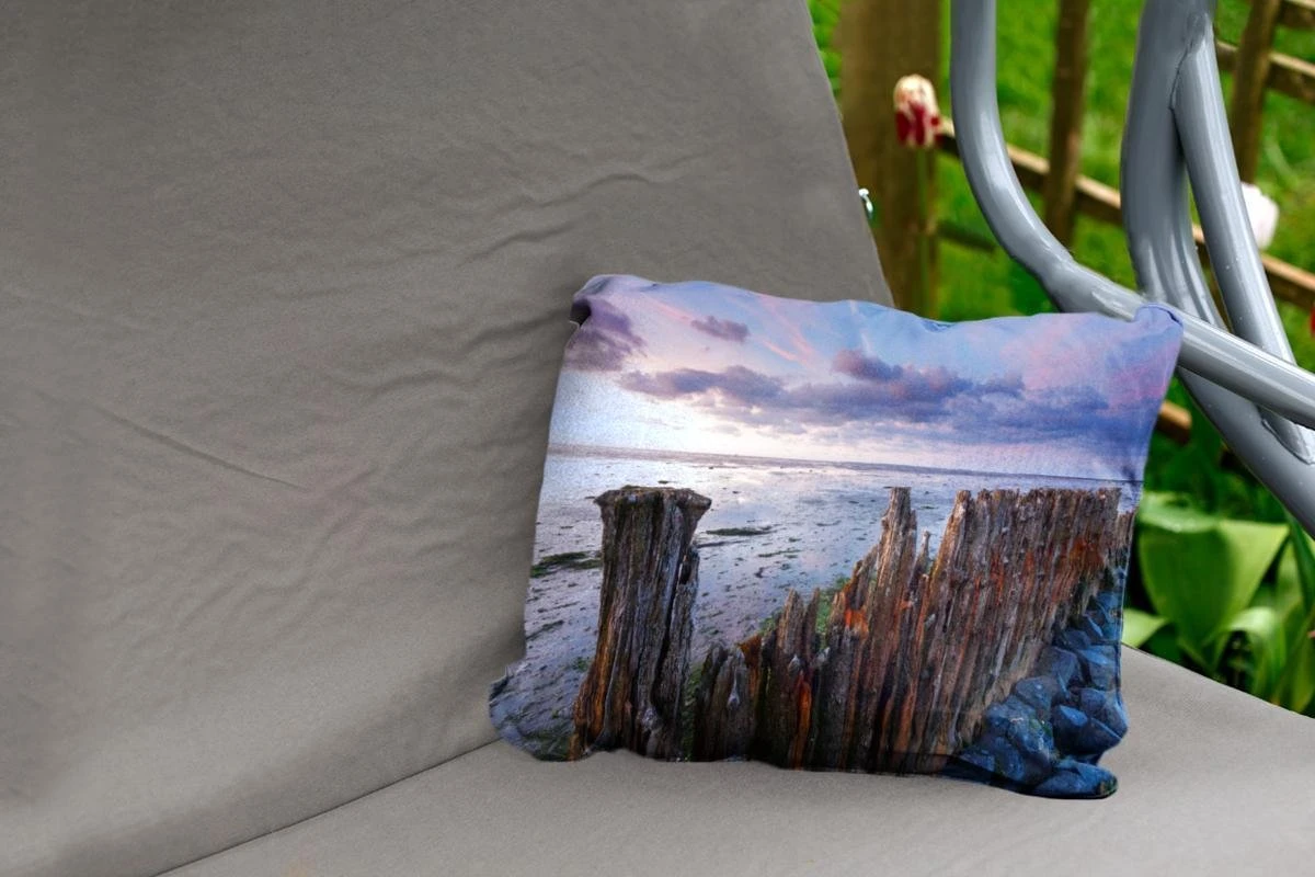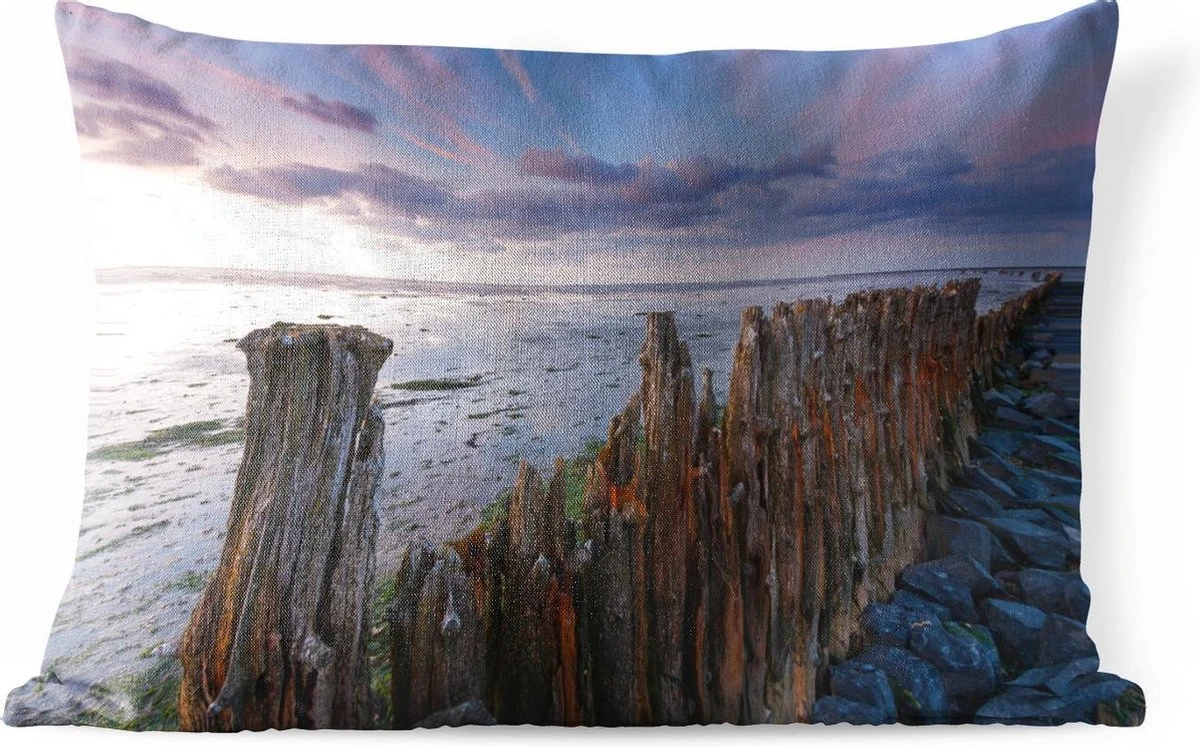 Bij een plaats genaamd Moddergat, staan een aantal palen in het water. In de blauwe lucht hangen een paar roze verlichte wolken. Verrijk het interieur van uw woonkamer met deze fantastische weergave.