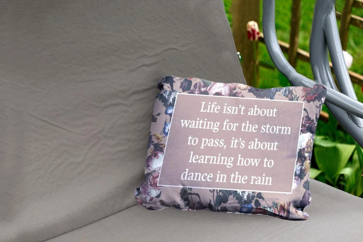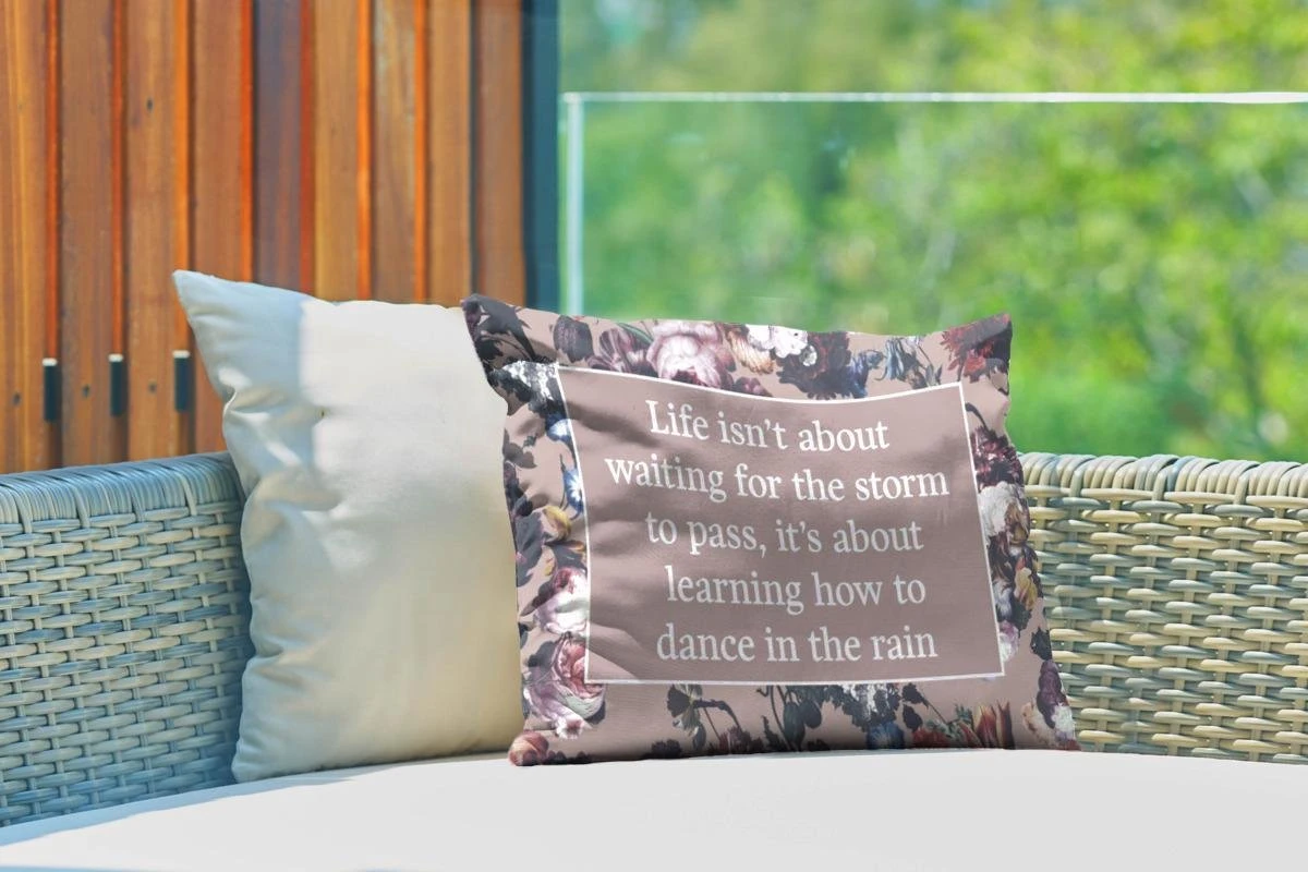 Quote ‘Life is about learning how to dance in the rain’ op een achtergrond met lente bloemen.