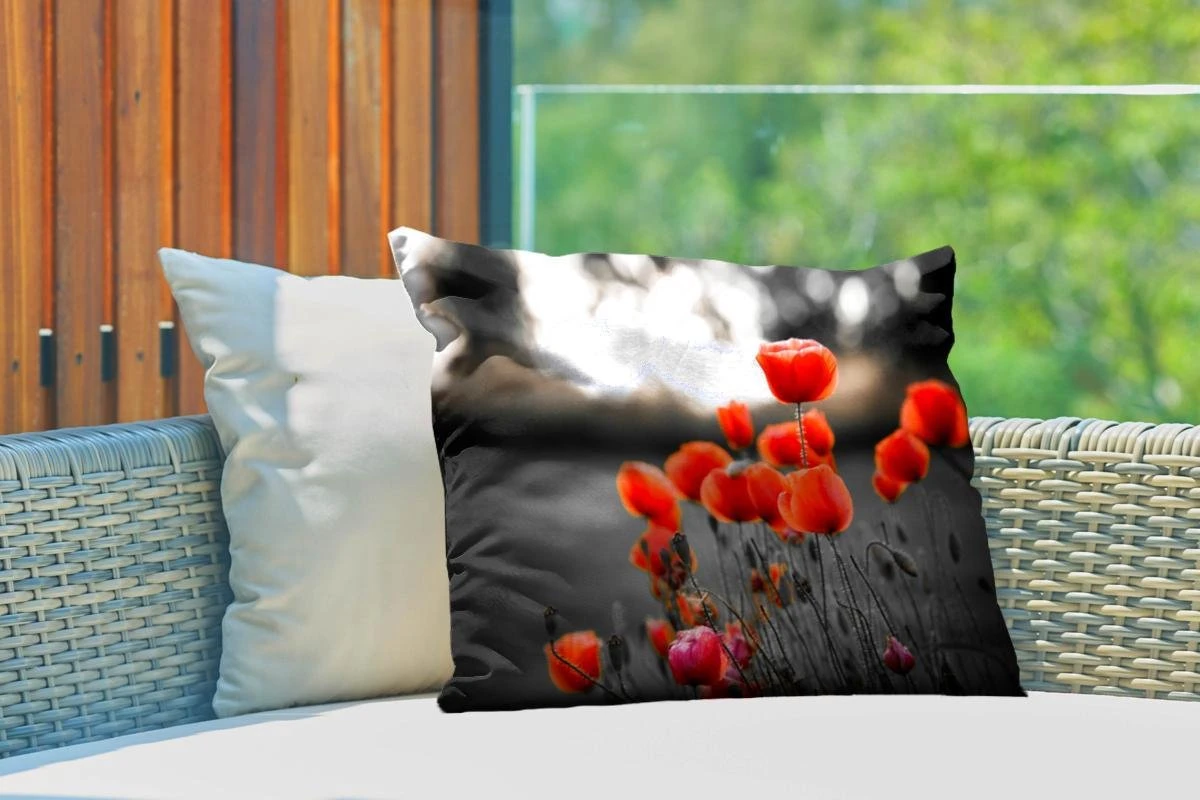 Een aantal prachtige rode klaprozen die zijn gekleurd, de omliggende omgeving is zwart wit gekleurd. Op de achtergrond is een wazig boslandschap te zien.