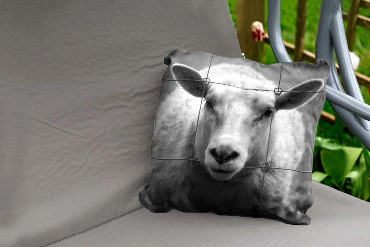 Een wit en wollig schaap steekt zijn kop door het hek op deze zwart-witte afbeelding.