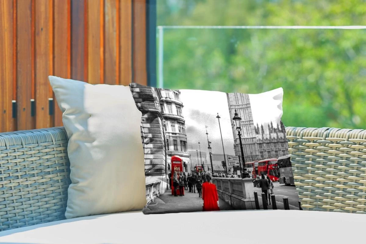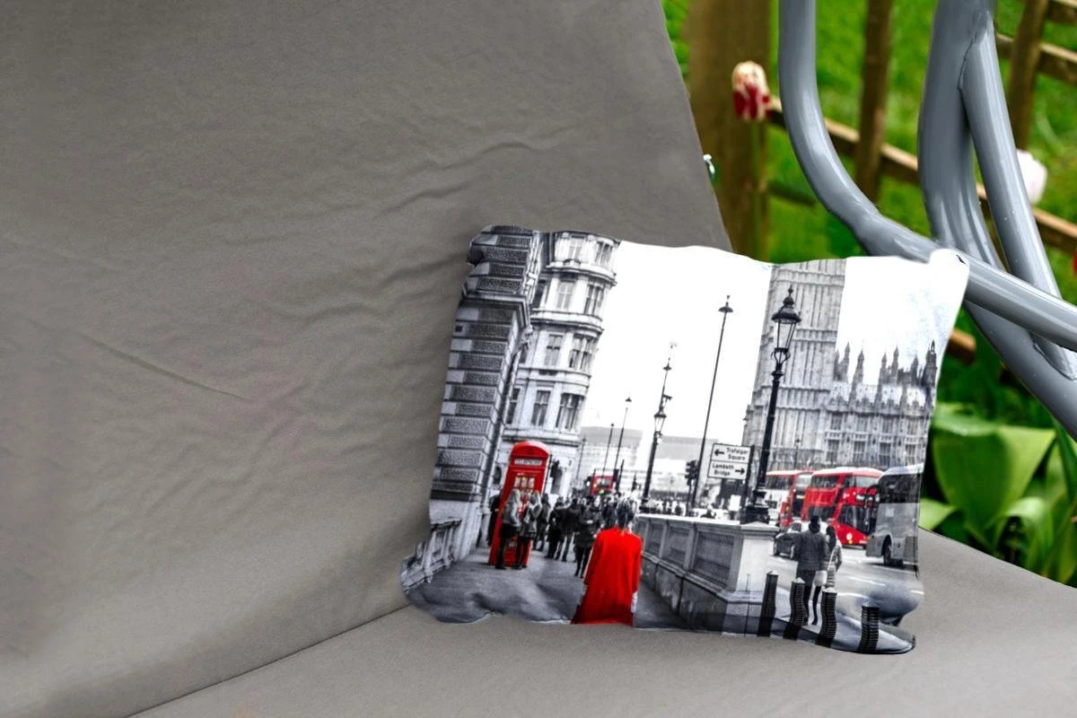 Een indrukwekkende zwart-wit foto van een vrouw in een rode jurk, deze foto is gemaakt in het Engelse Londen.