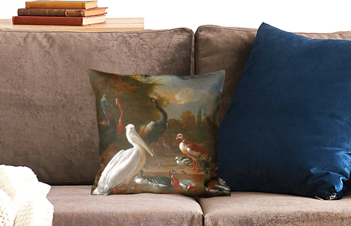 Kunstreproductie van Een pelikaan en ander gevogelte bij een waterbassin, bekend als ‘Het drijvend veertje’, Melchior d’Hondecoeter, ca. 1680