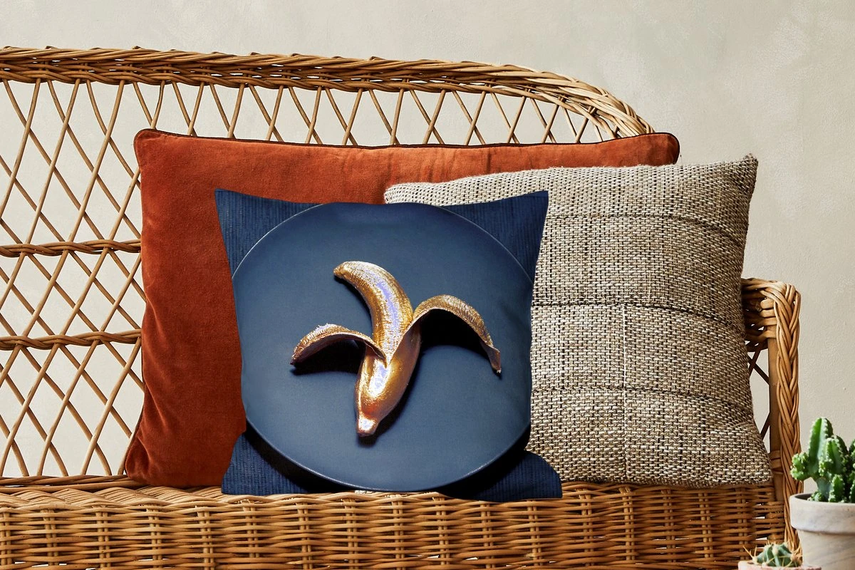 Geef de woonkamer een luxe uitstraling met deze afbeelding van een goud geverfde banaan op een donker bord. Het stuk fruit vormt een groot kleurcontrast met de achtergrond en valt hierdoor goed op.