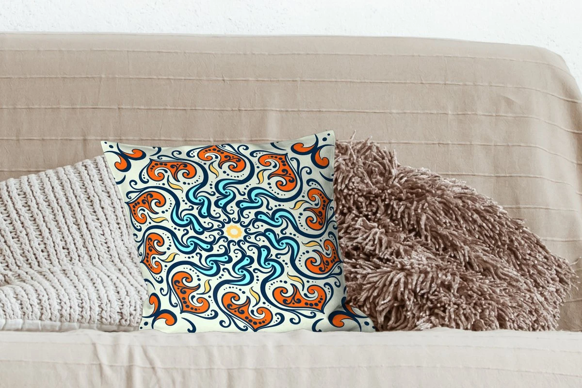 Patroon van een mandala met oranje en blauwe tinten op een lichte achtergrond.