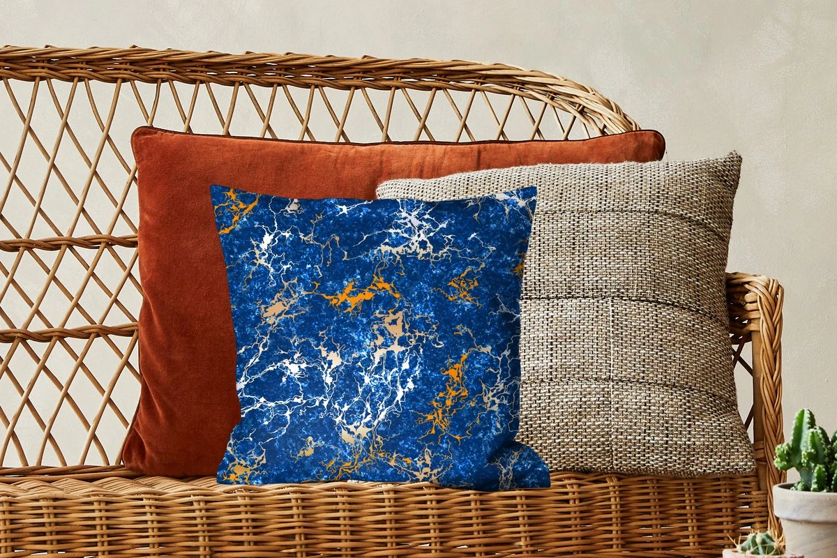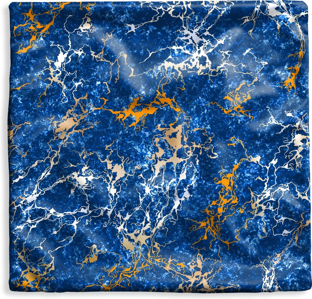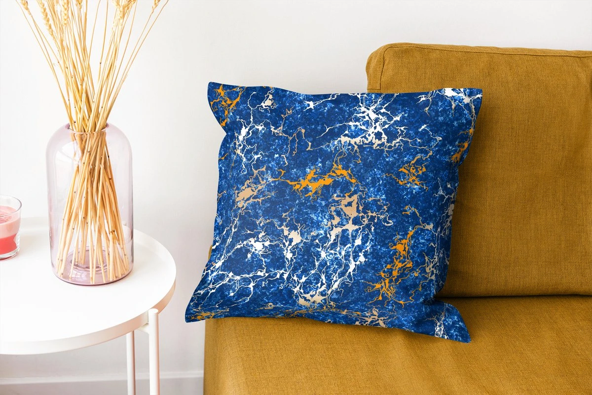 Abstracte marmertextuur met gouden en blauwe elementen.