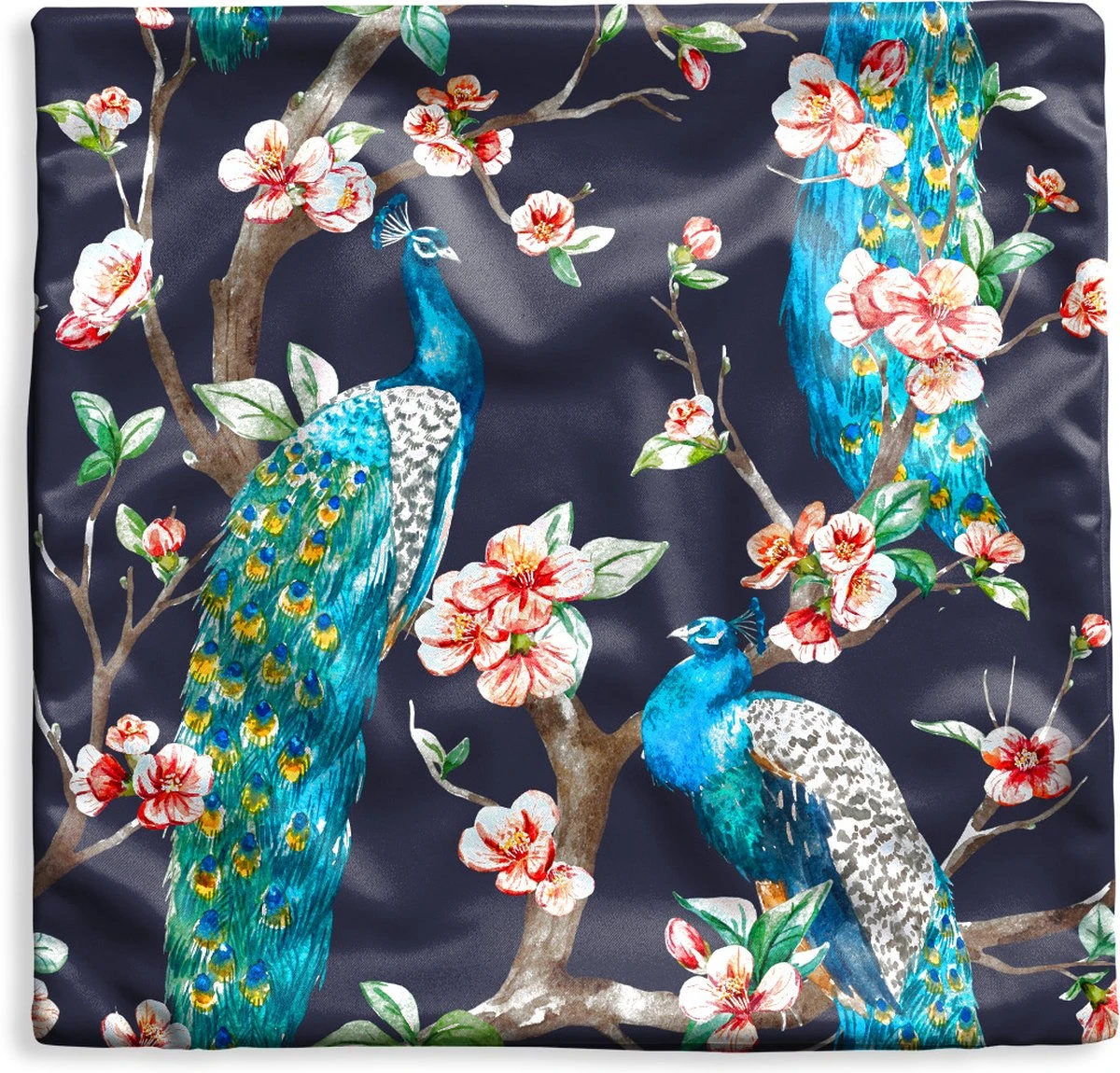 Een patroon van pauwen in een boom met bloeiende bloesem.