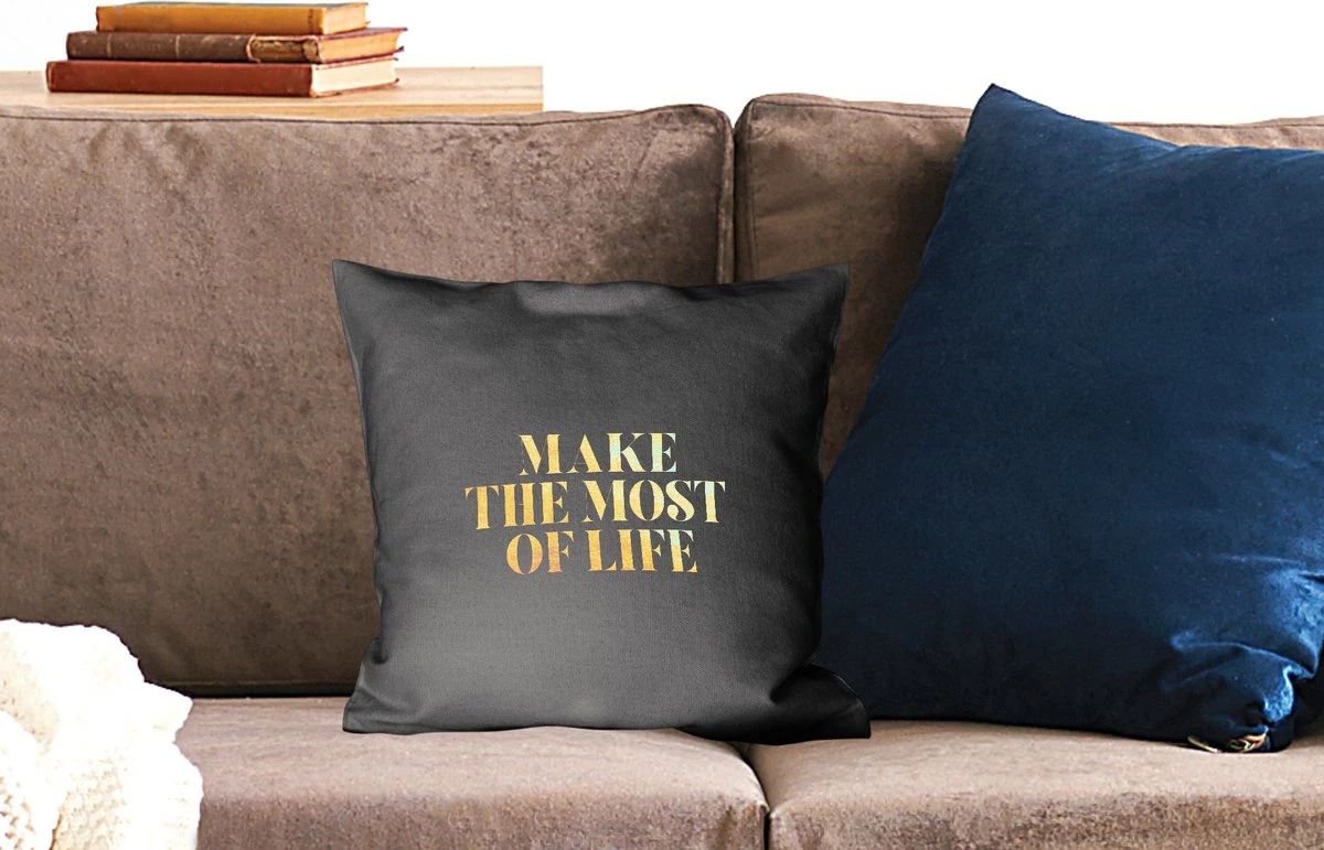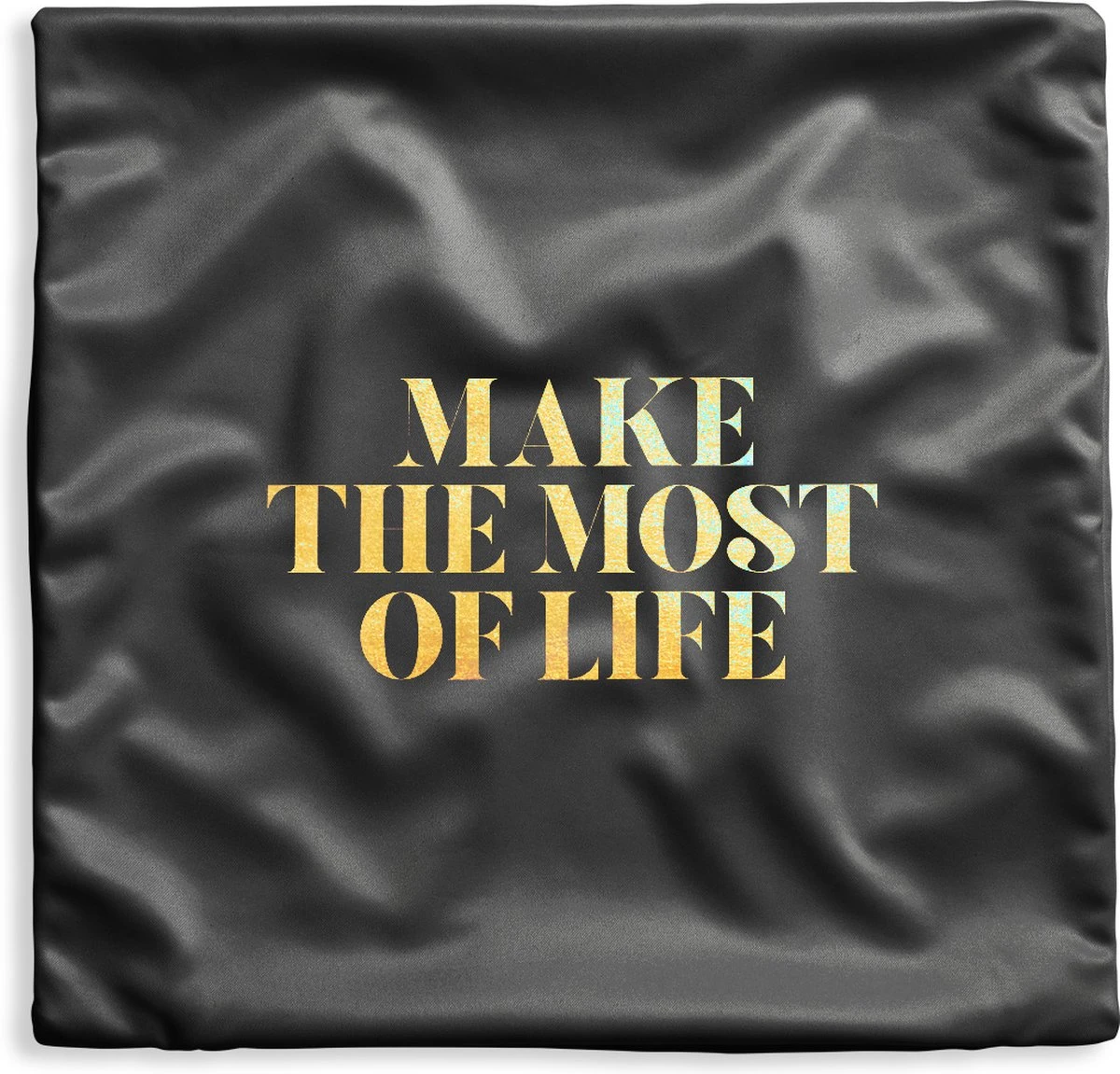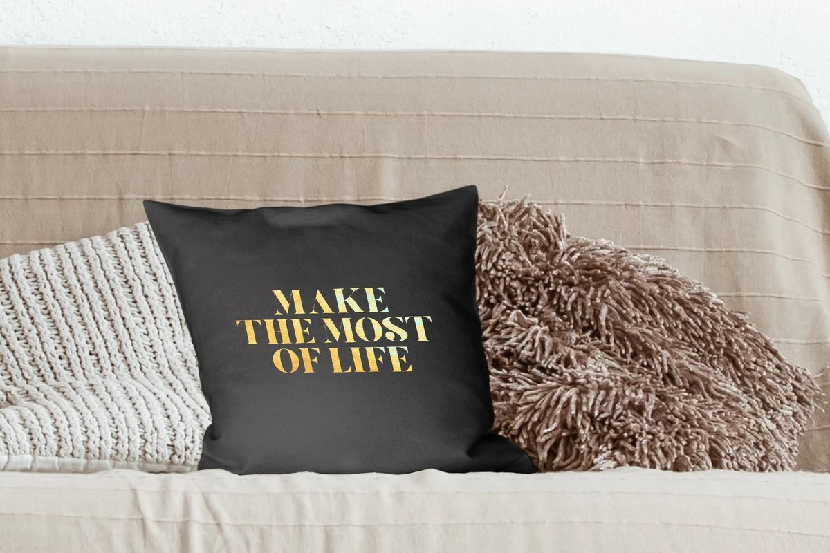 Goudkleurige quote ‘Make the most of life’ tegen een zwart marmeren achtergrond.