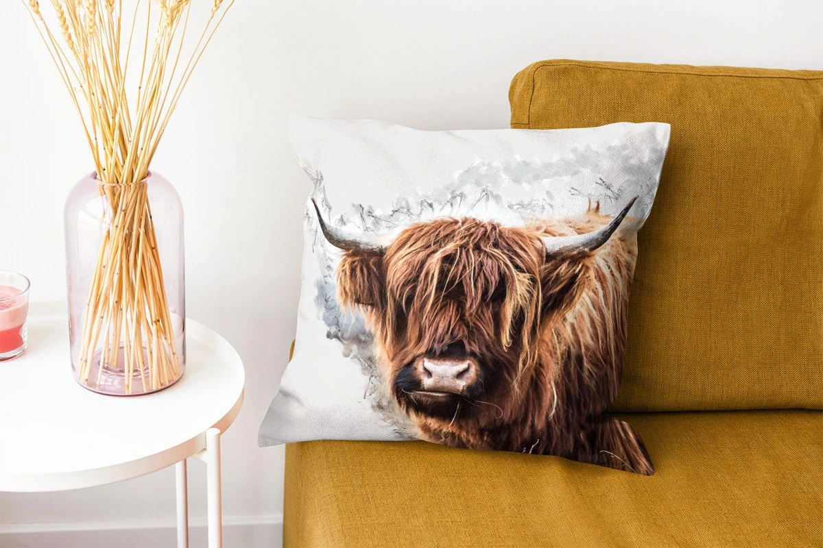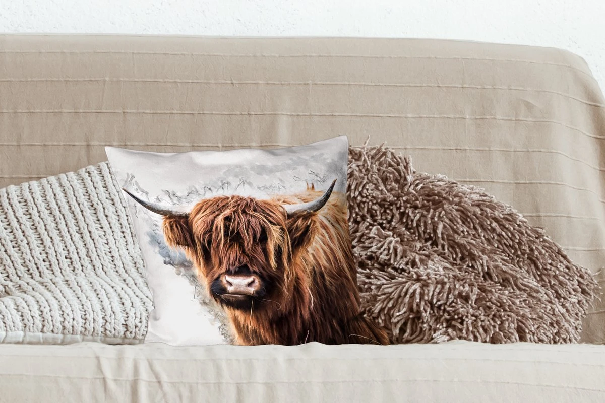 Portret van een Schotse hooglander. Het dier wordt omringd door zwarte rook.