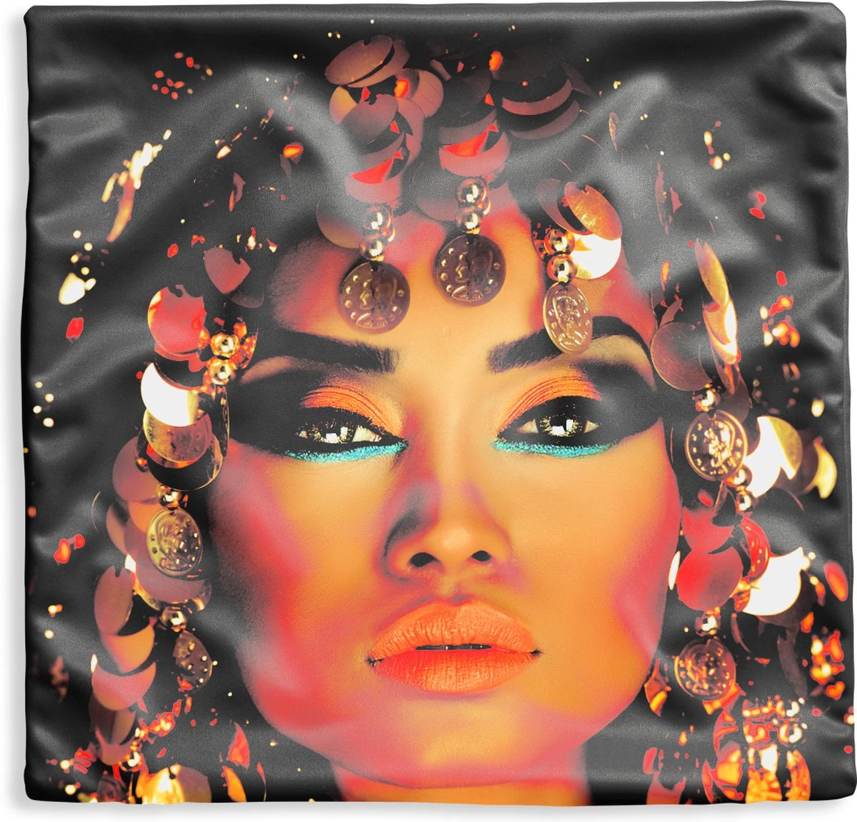 Een portret van een vrouw omhuld door goud. Haar ogen zijn versierd met zwarte, gouden en blauwe oogschaduw.