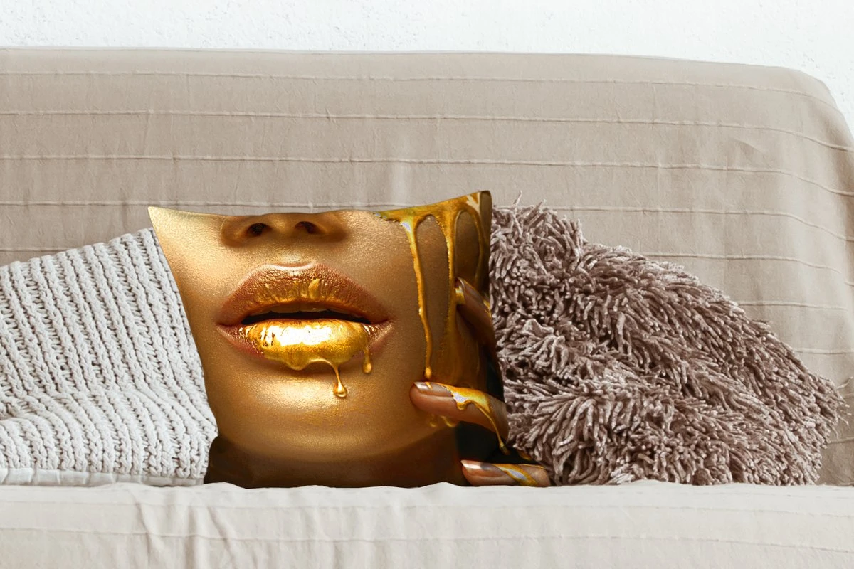 Een close-up van een vrouw, de gouden verf druipt van haar gezicht.