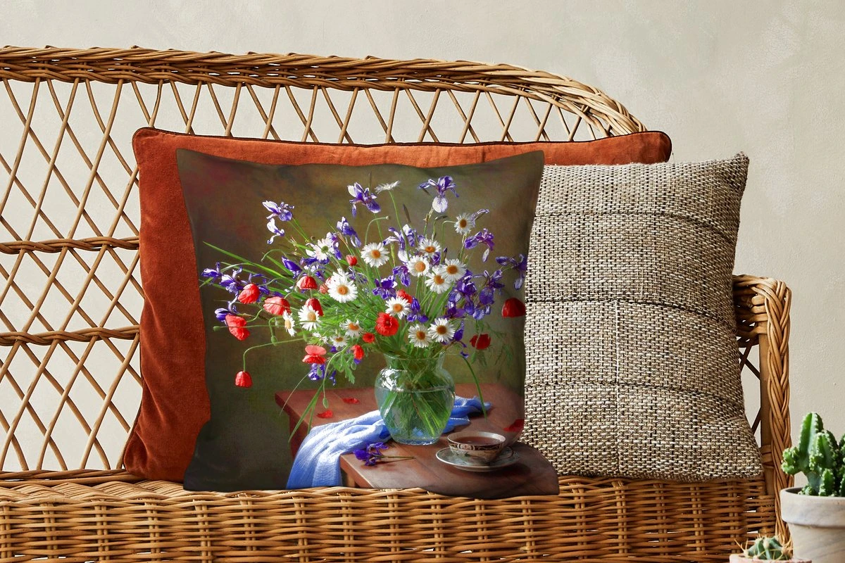 Stilleven van een vaas met bloemen en een kop thee. In het werk zijn verschillende kleuren verwerkt.