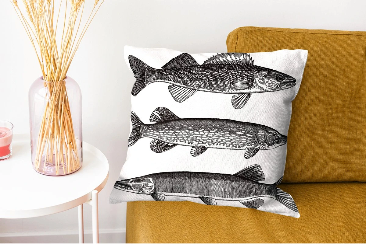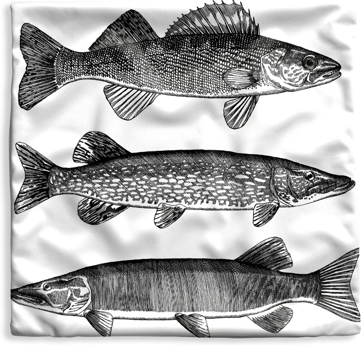 Prachtige tekening van drie snoeken. De snoek is een zoetwatervis en heeft een karakteristieke, torpedo-achtige lichaamsbouw. Snoeken kunnen 15 jaar oud worden.
