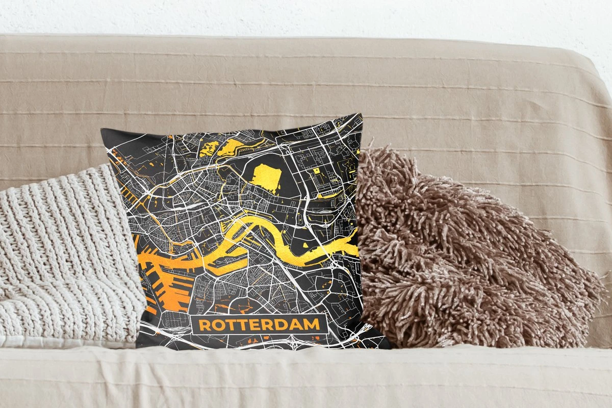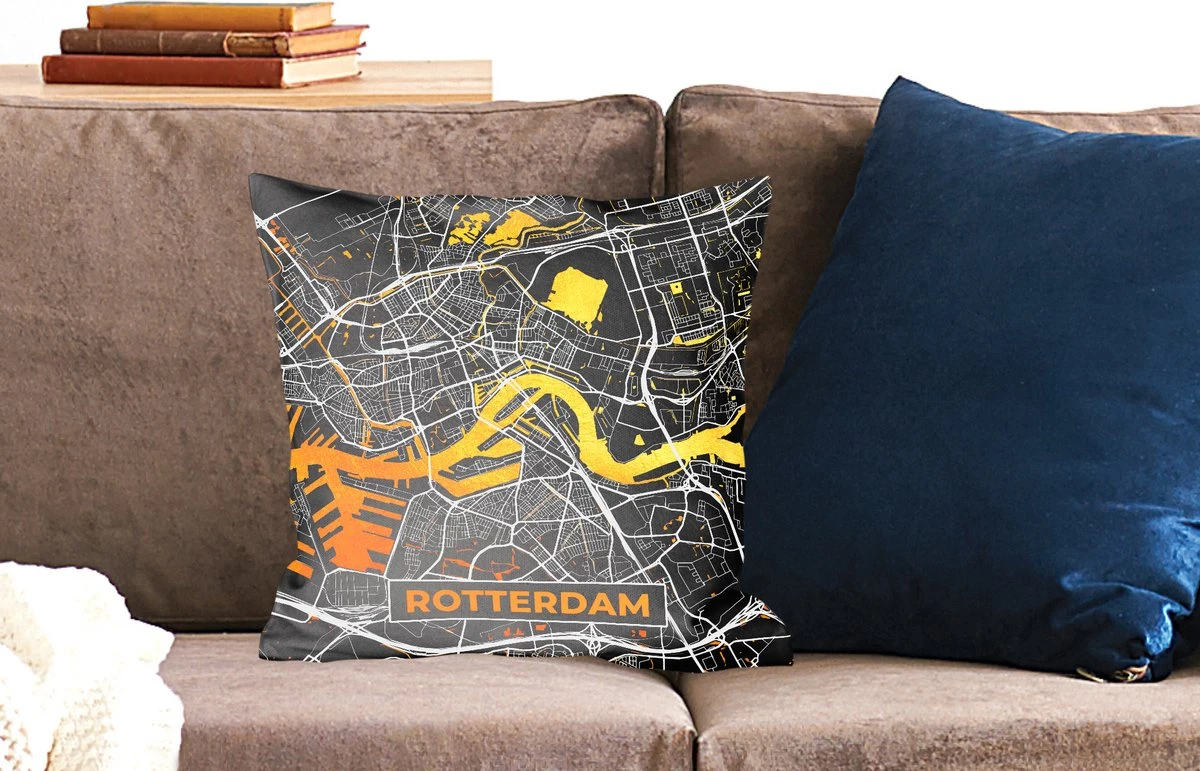 Kaart van Rotterdam. De plattegrond is zwart met goudkleurige accenten en witte straten.