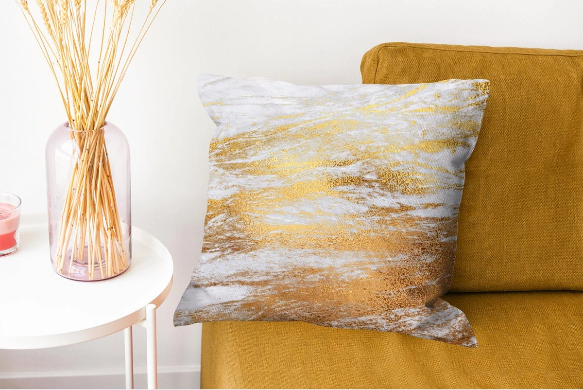 Het marmer op deze afbeelding heeft een grijze kleur en wordt bedekt met gouden details. De gouden details maken dit beeld uniek.