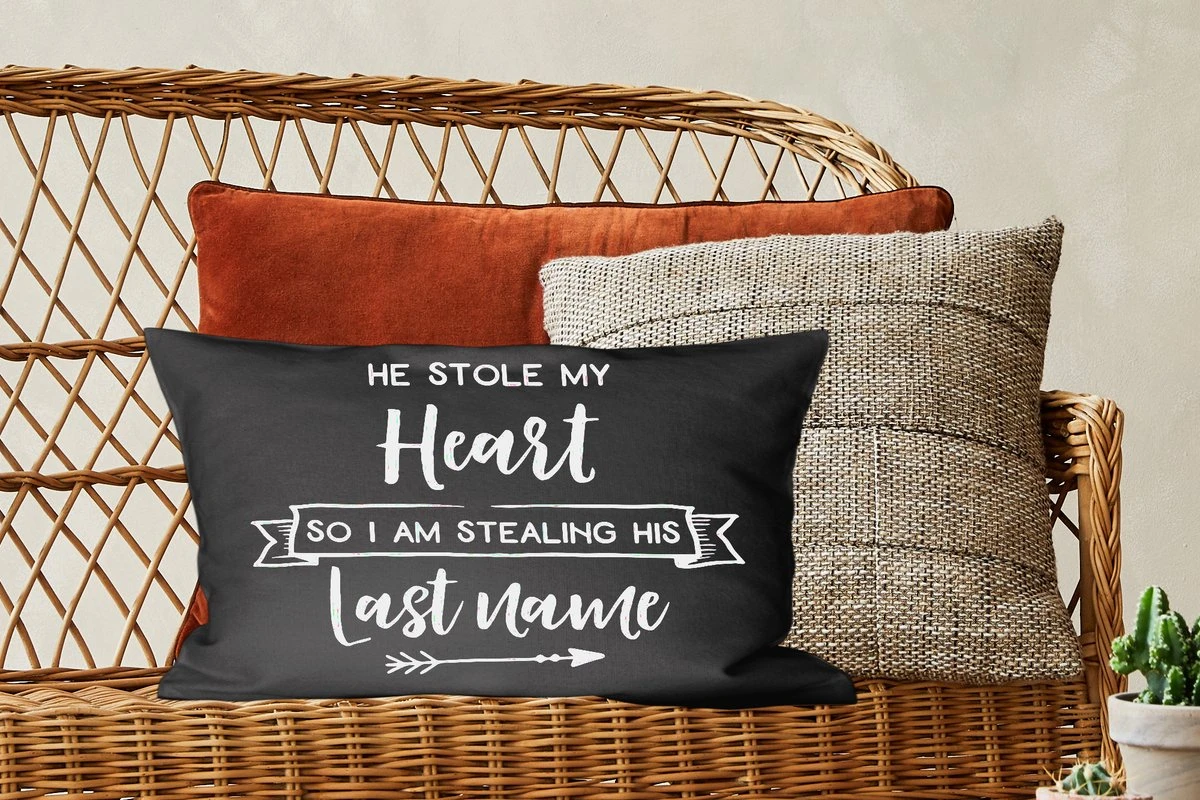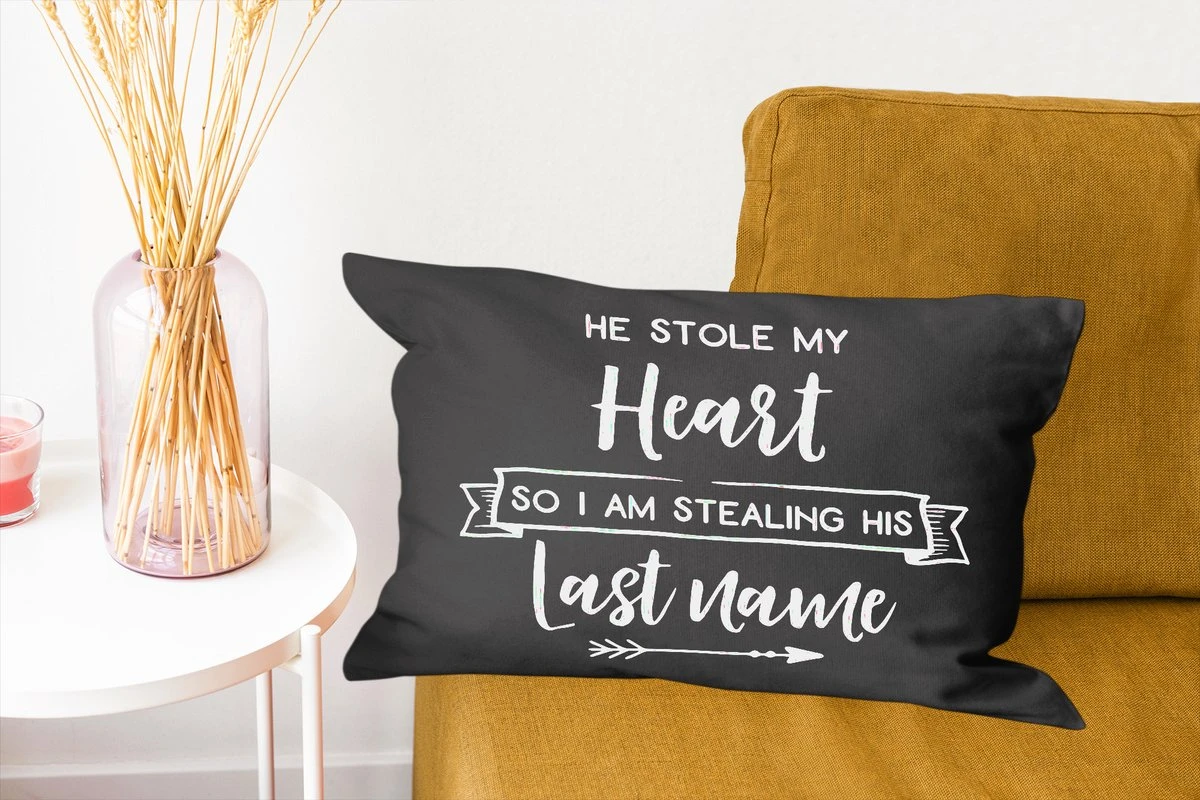Geef je huis een romantische look met deze wanddecoratie! Witte letters in verschillende stijlen spellen de quote ”he stole my heart so I am stealing his last name” op een zwarte achtergrond. De quote is toepasselijk voor een koppel dat besluit om het huwelijk aan te gaan. Deze weergave komt goed tot zijn recht in de woonkamer of als een cadeau voor Valentijn.