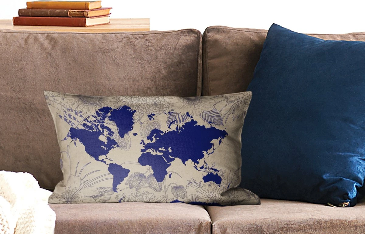 Blauwe wereldkaart omringd door bloemen en planten op een bruine achtergrond.