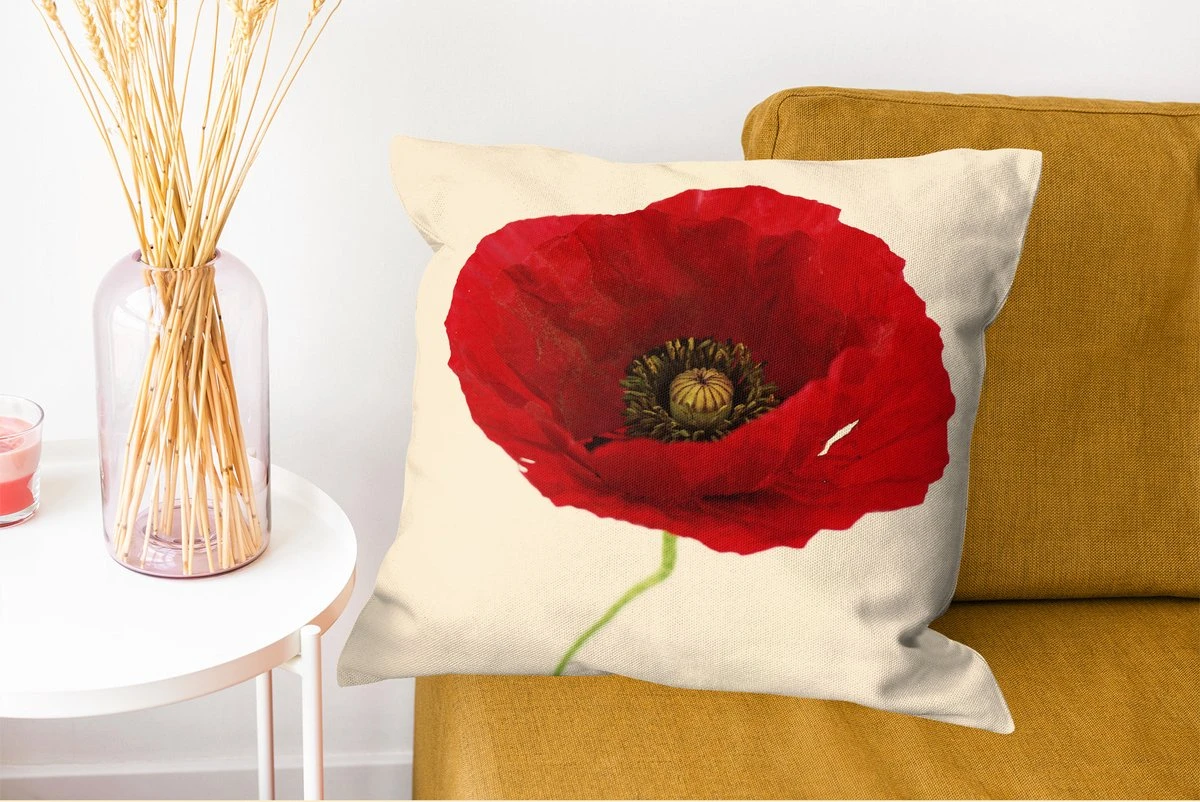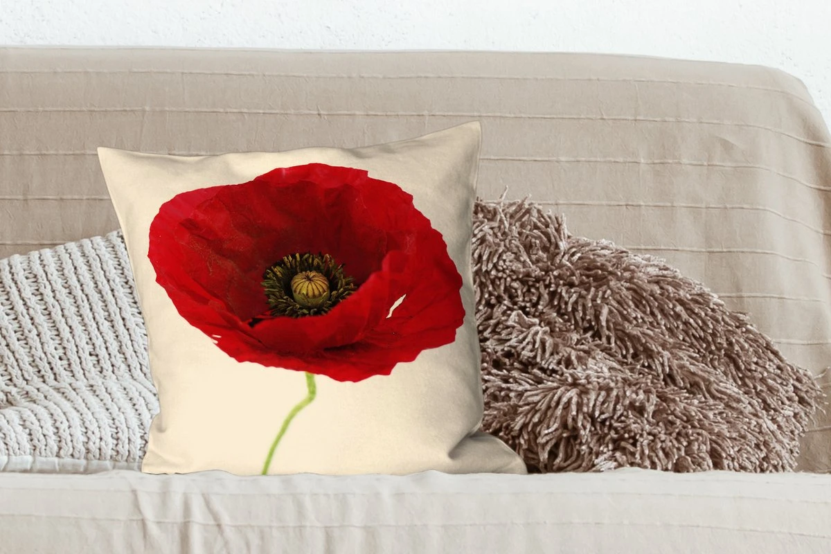 Gedetailleerd beeld van een knalrode Klaproos met groene stengel, tegen een gele achtergrond. Papaveraceae (Klaproosfamilie).