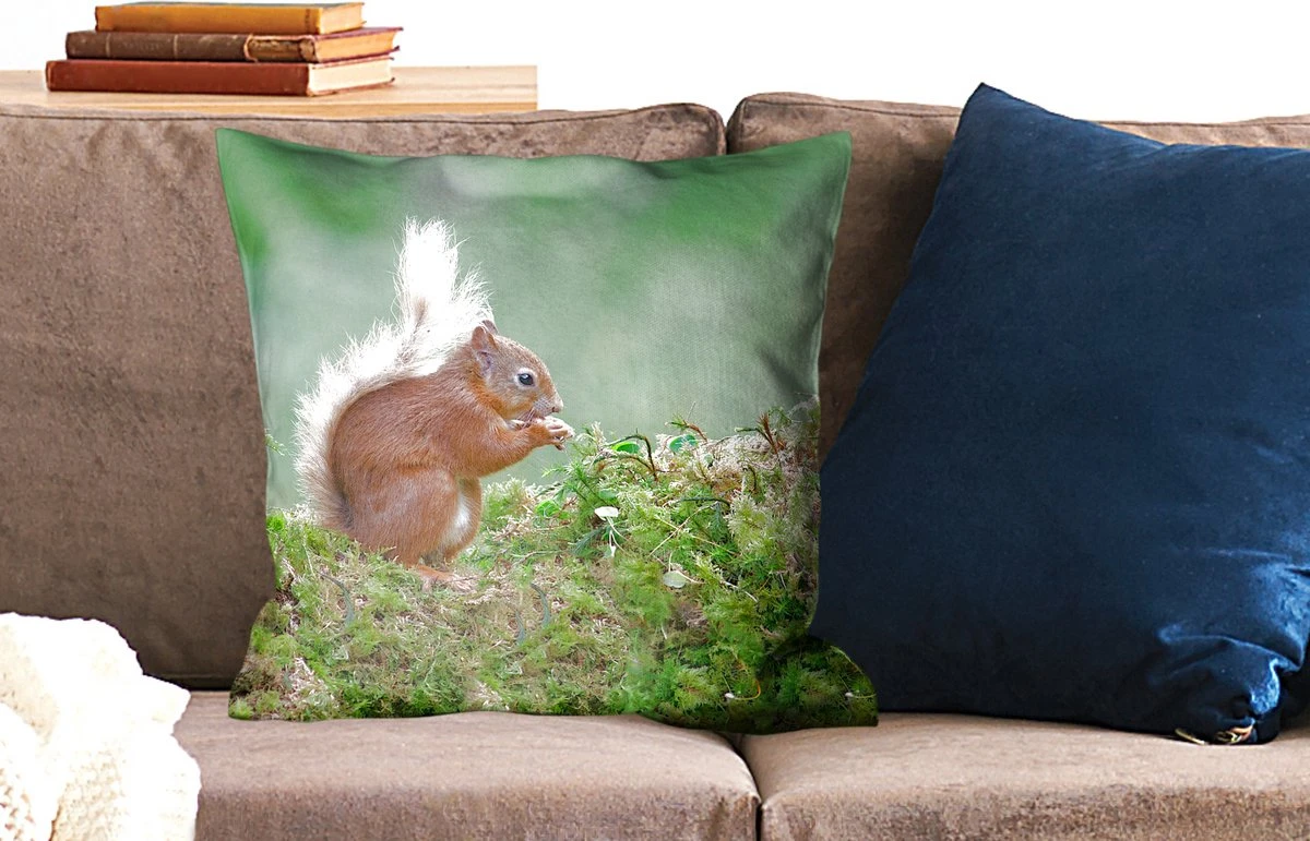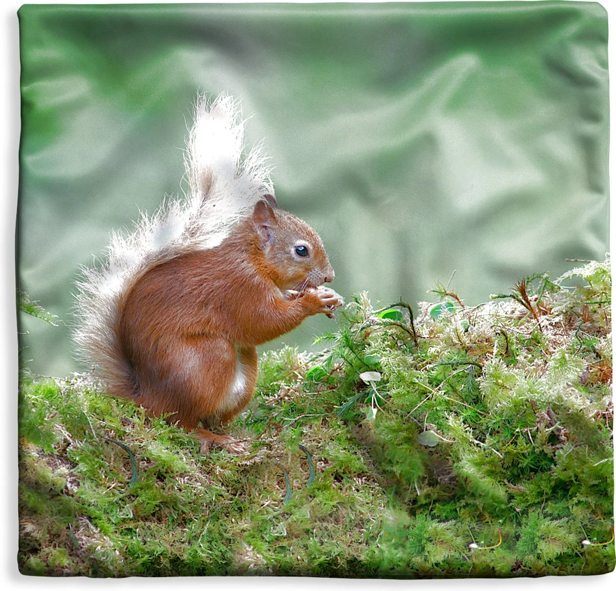 Een weergave van een eekhoorn in een bos. Hij zit op een boomstronk bedekt met groene mos.