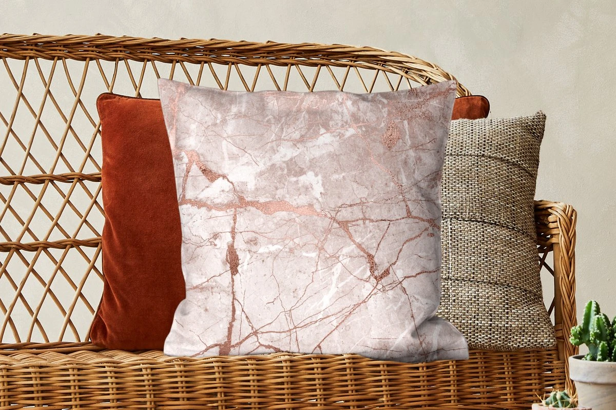 Het roze gekleurde marmer is dooraderd met rosé gouden lijnen die samen een patroon vormen.