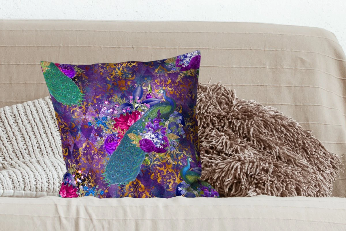 Patroon met pauwen en bloemen op een paarse achtergrond met gouden accenten.