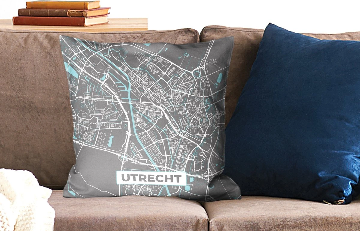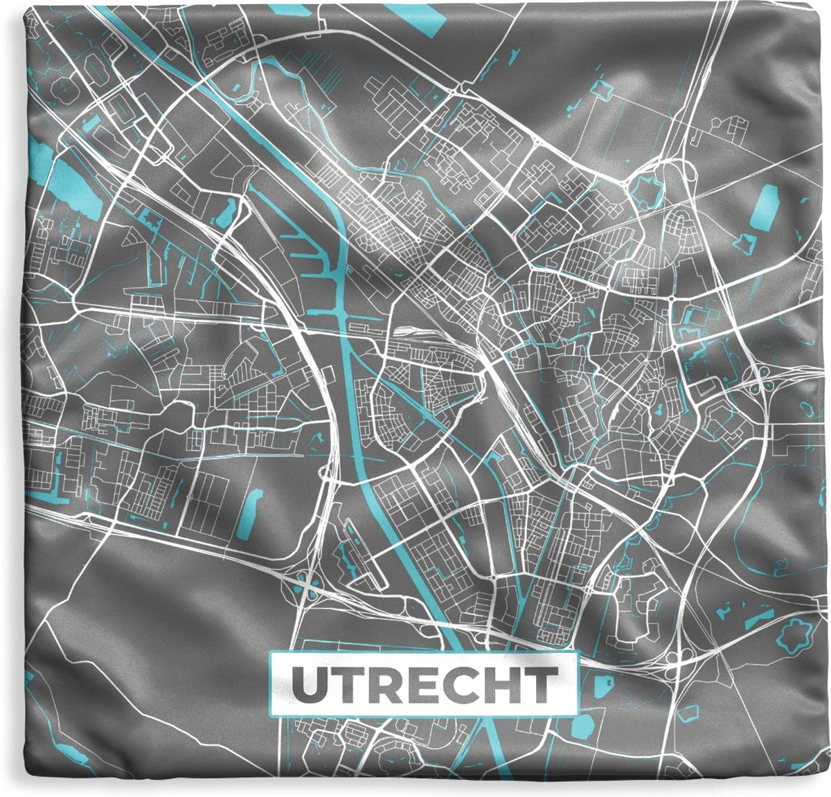 De plattegrond van de stad Utrecht vanuit vogelperspectief in grijze en blauwe kleuren. De hele stad is te zien op deze kaart.