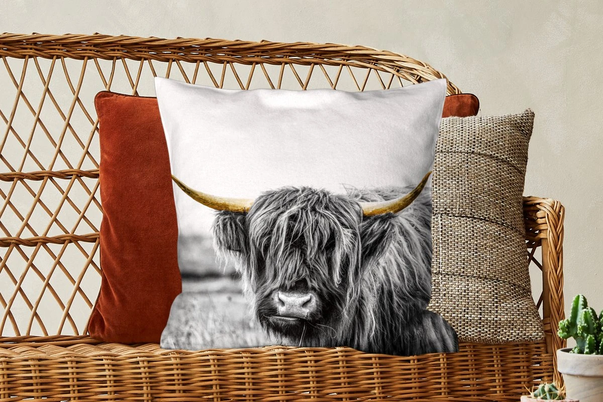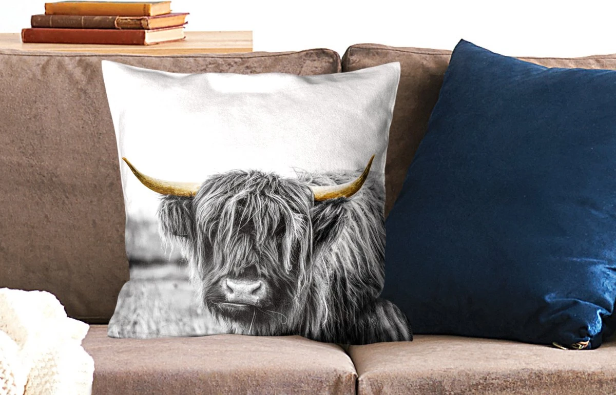 Zwart – wit Schotse hooglander staand in het gras. Het dier heeft gouden hoorns.