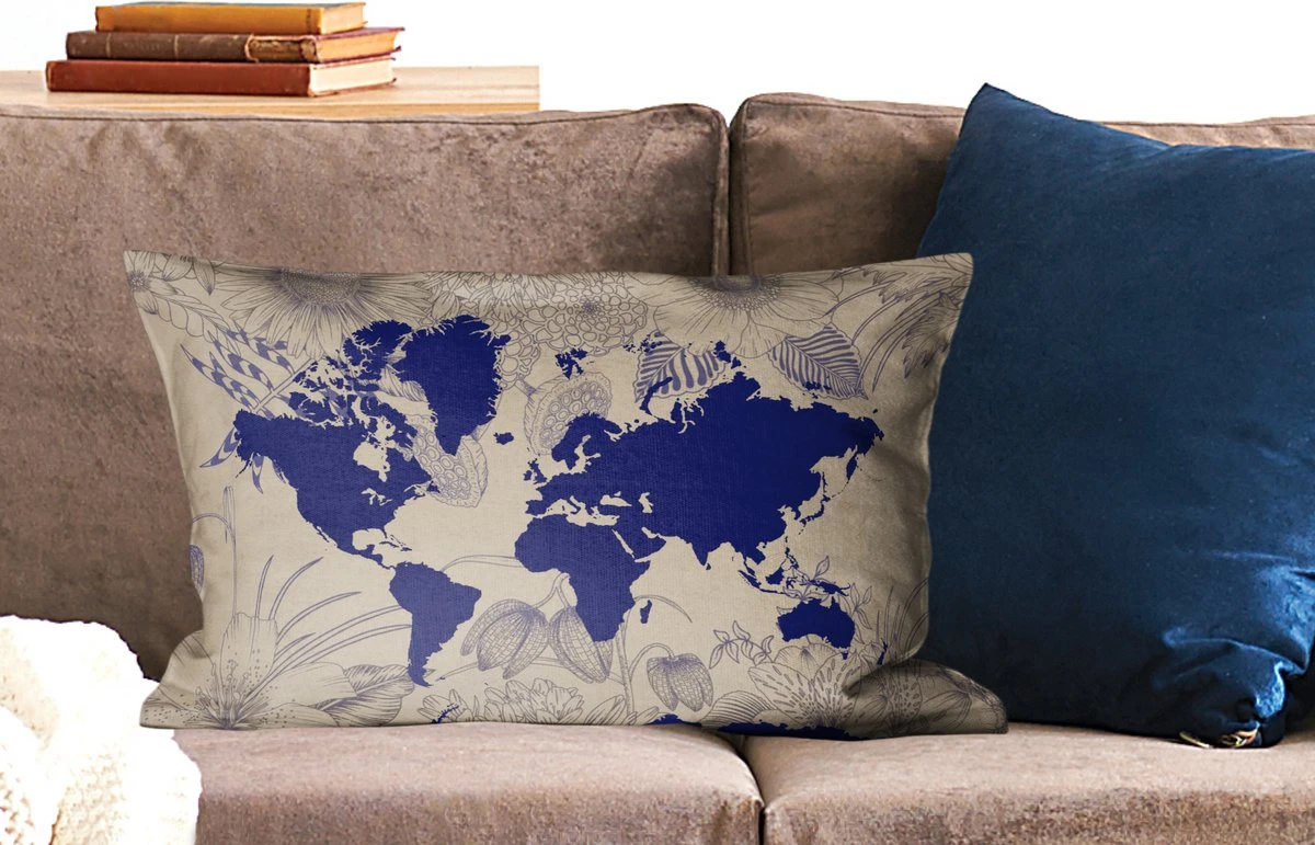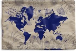 Blauwe wereldkaart omringd door bloemen en planten op een bruine achtergrond.