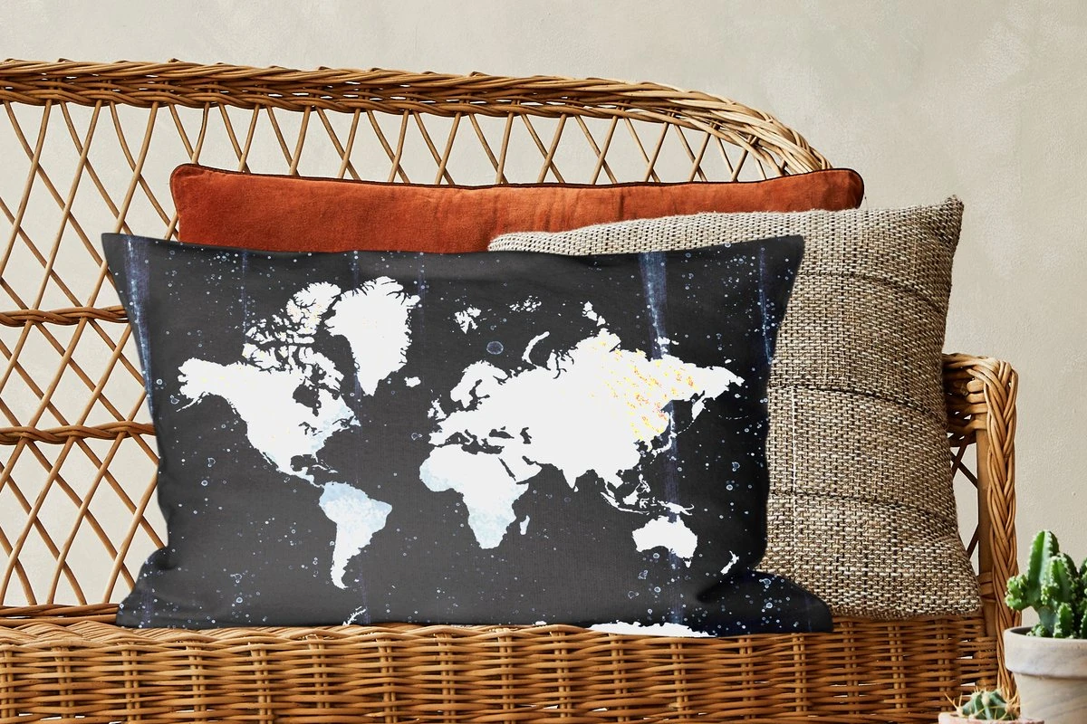 Witte wereldkaart op een donkerblauwe achtergrond met lichte accenten. De kaart is gemaakt met waterverf.