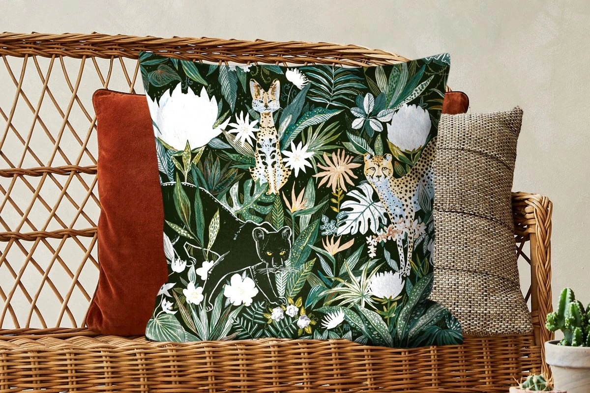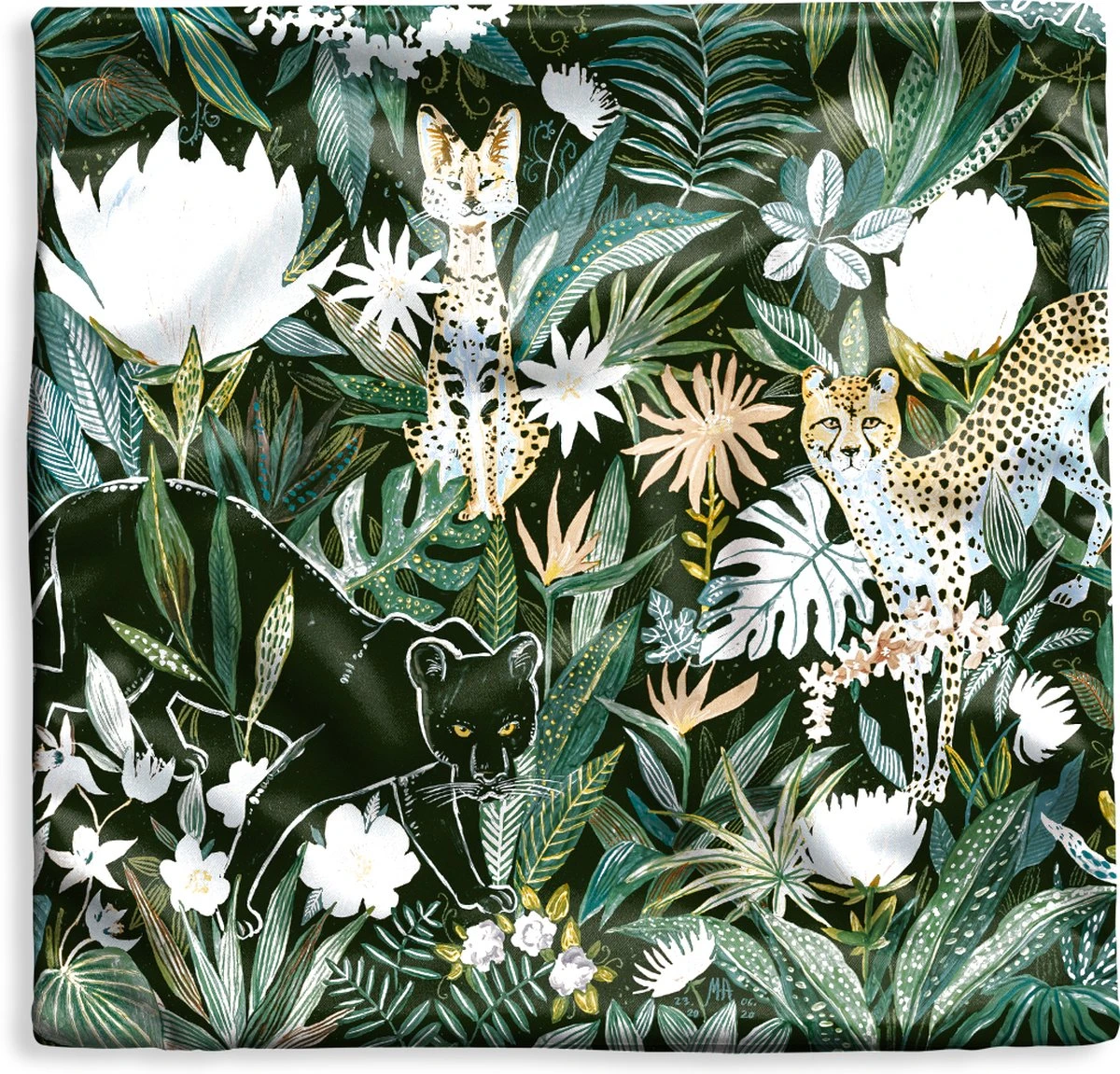 Drie verschillende roofdieren, waaronder een panter en luipaard, sluipen tussen de planten van de jungle door.