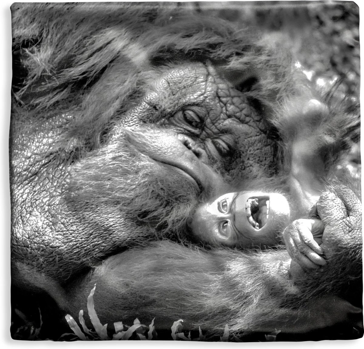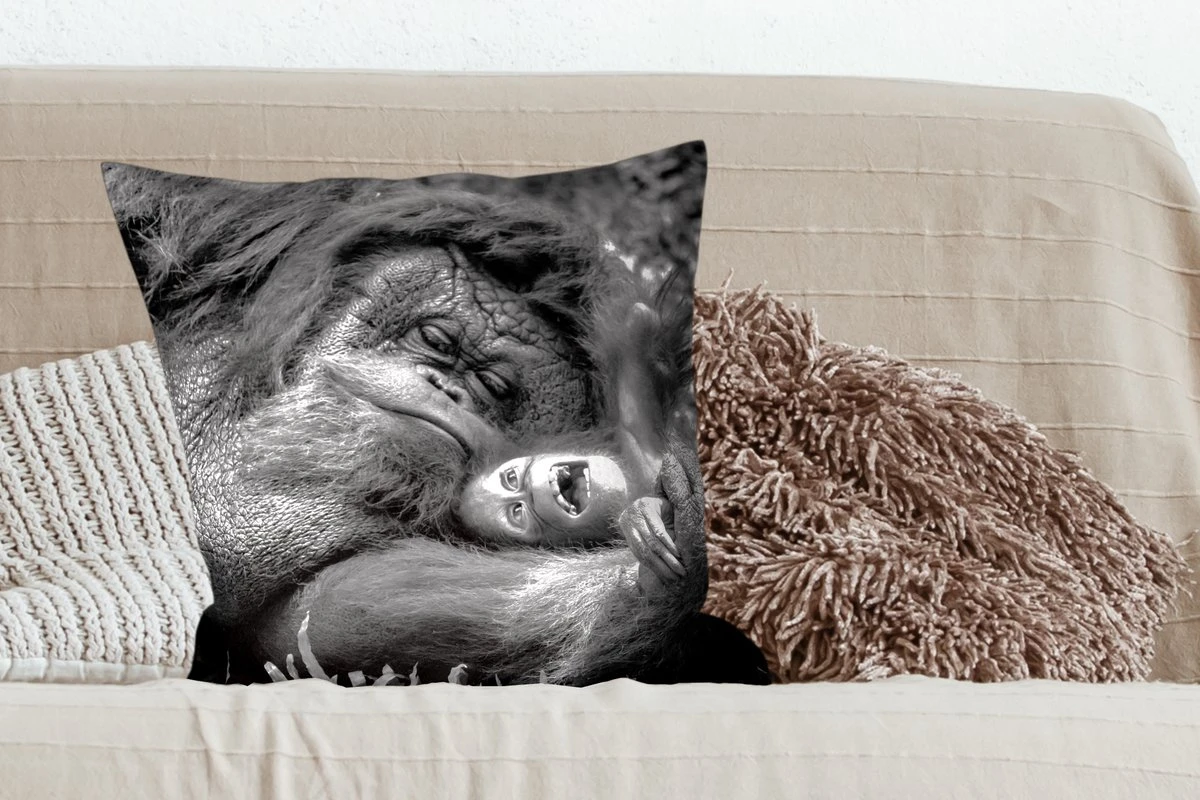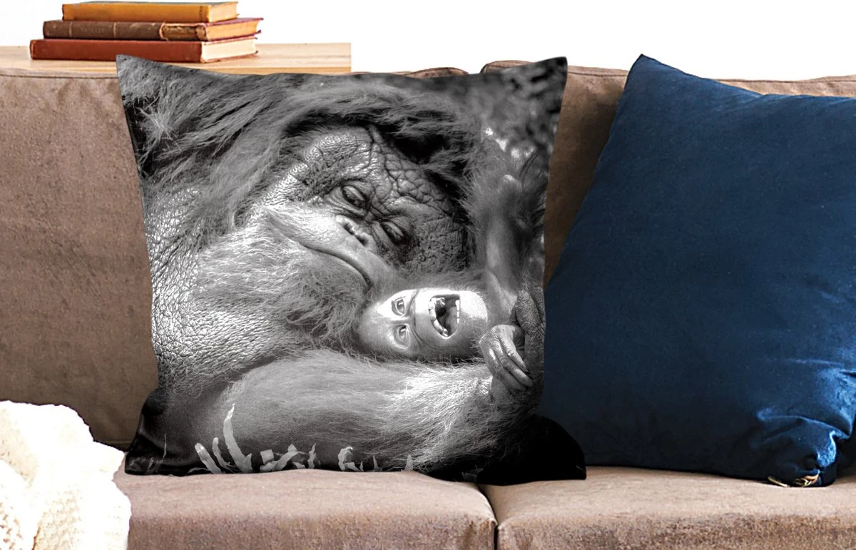 Een weergave in zwart-wit van een liefdevolle Orang-oetan, dat haar jong stevig tegen zich aan drukt. Deze afbeelding komt goed tot zijn recht in het interieur van de woonkamer.