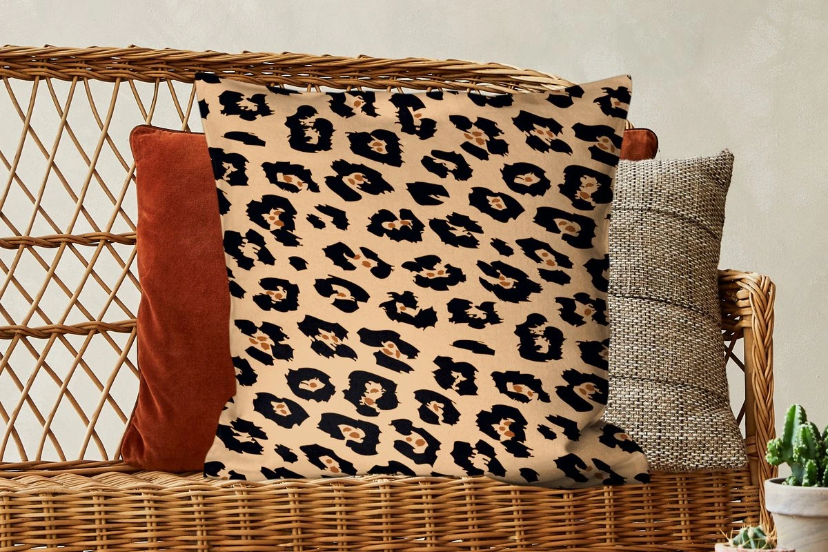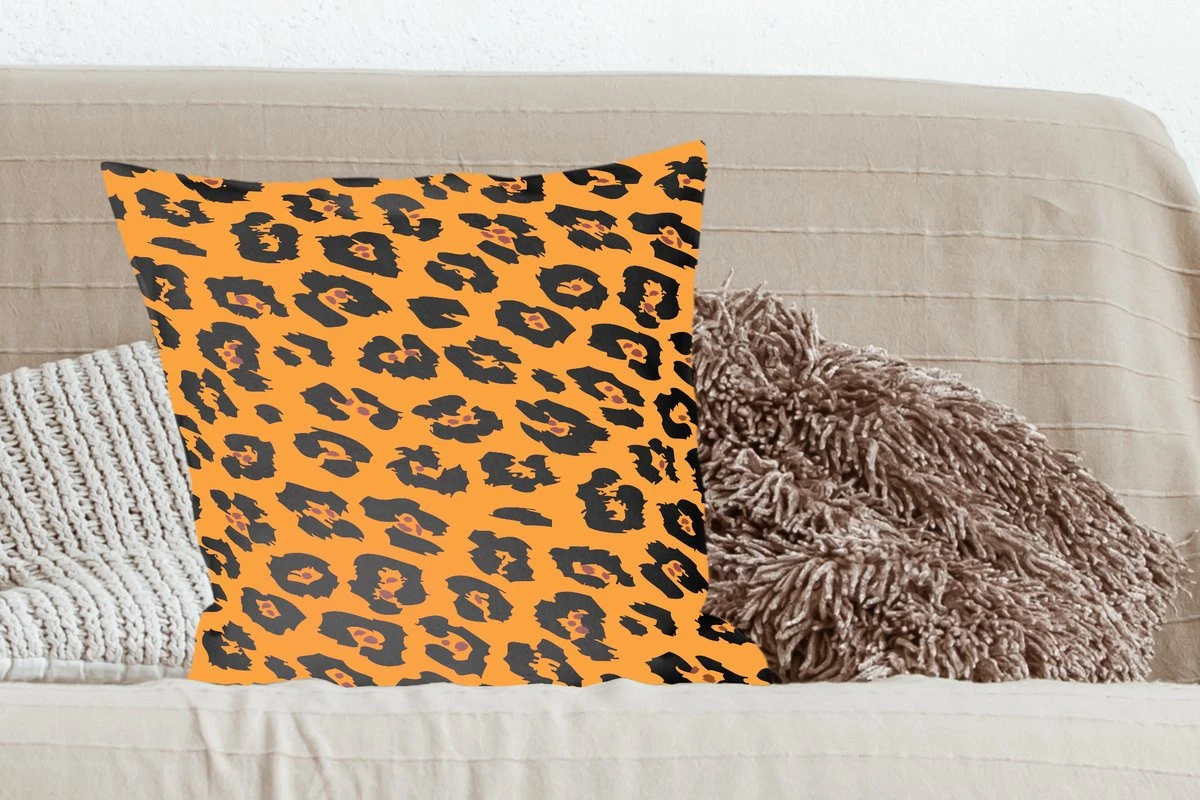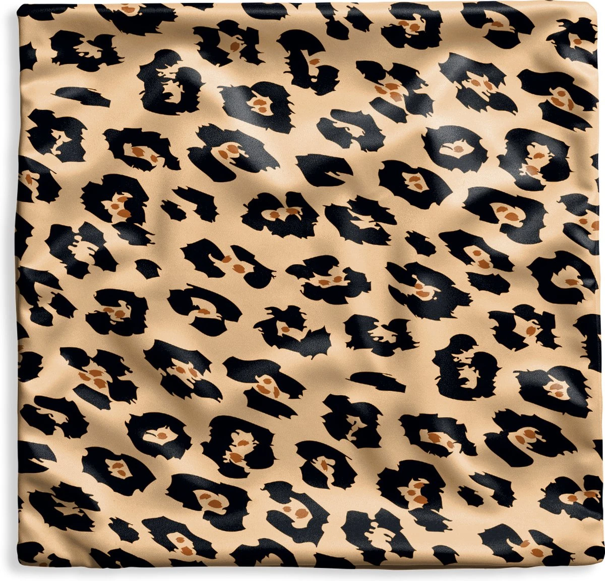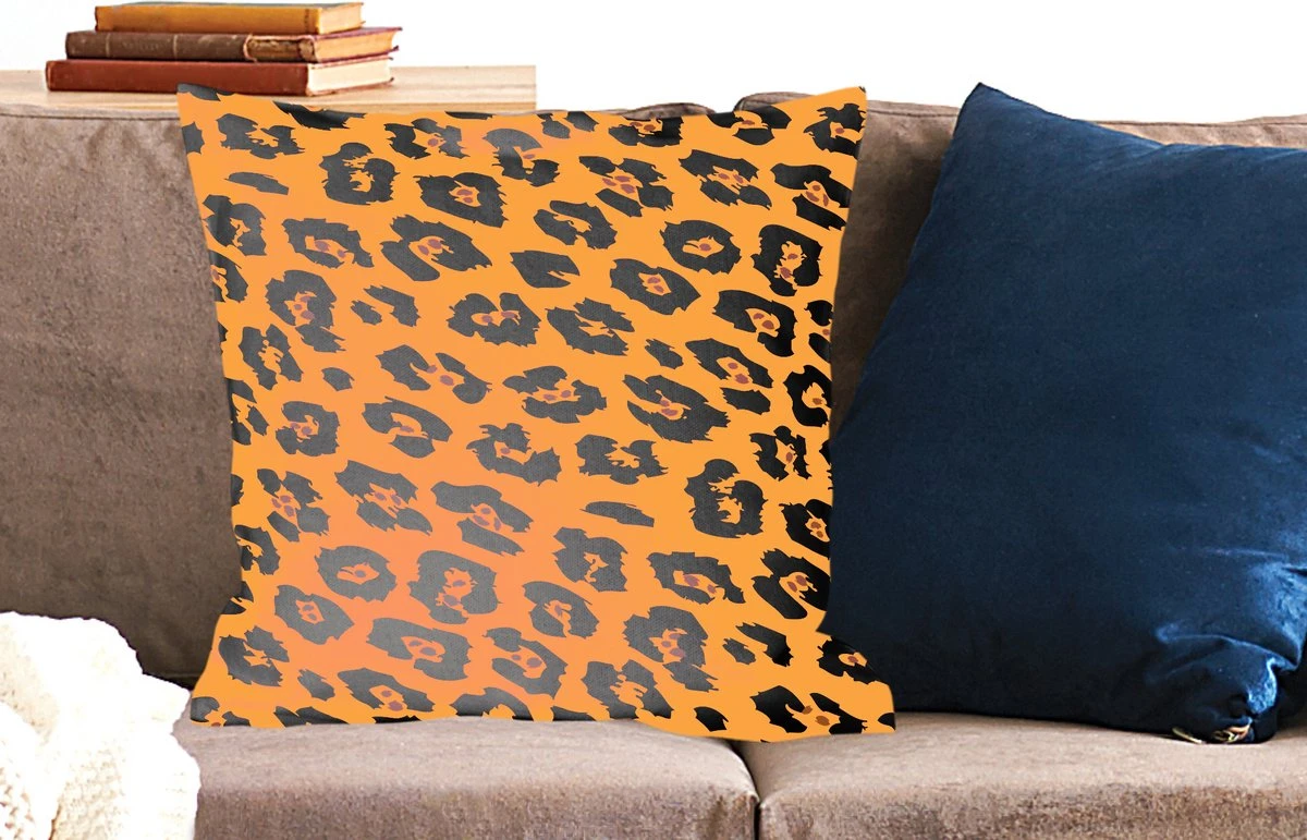 Panterprint met zwarte vlekken op een oranje achtergrond.