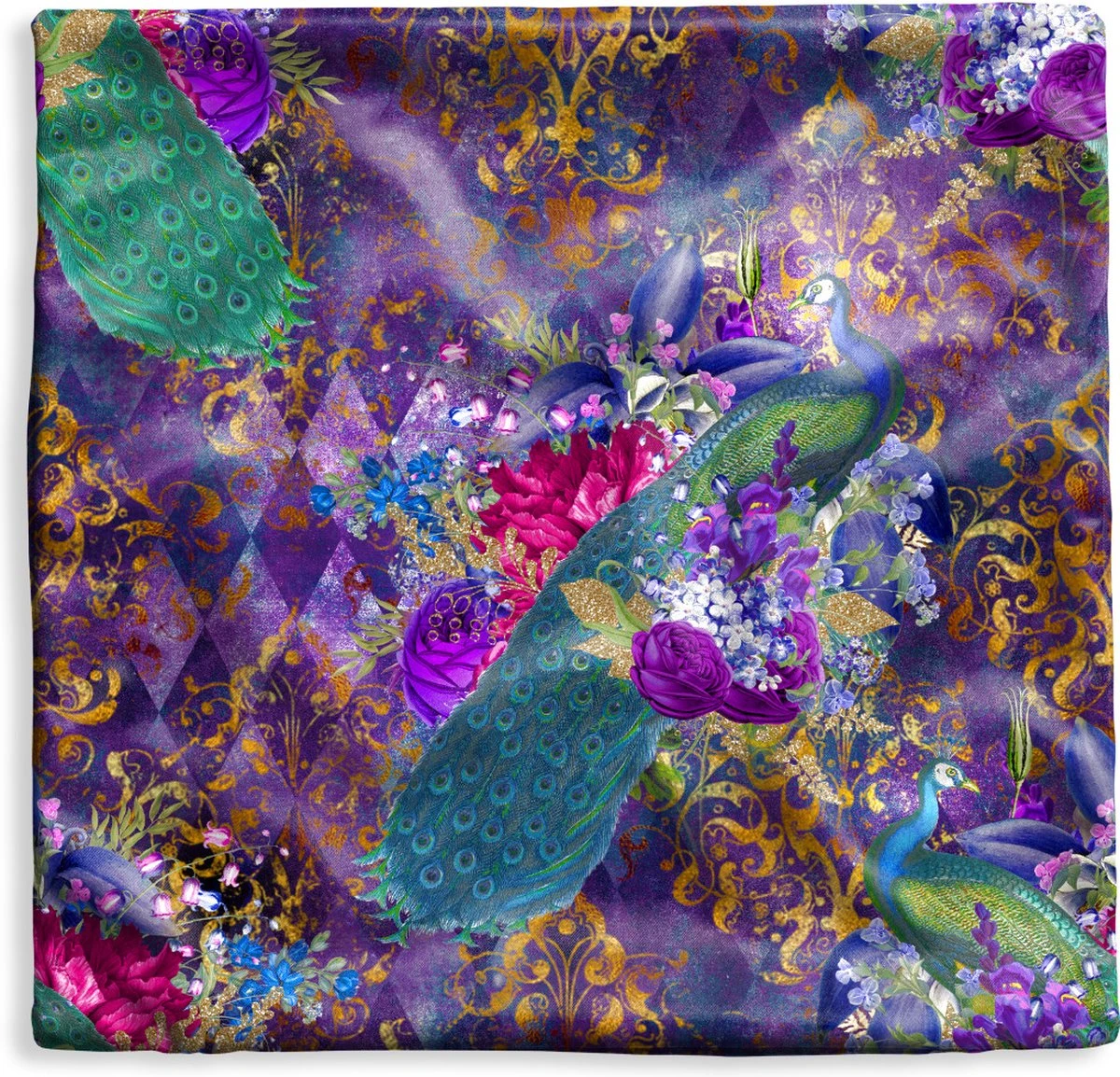 Patroon met pauwen en bloemen op een paarse achtergrond met gouden accenten.