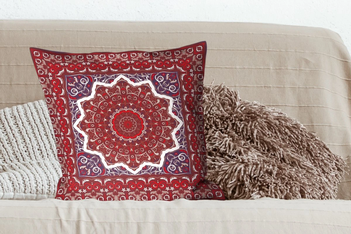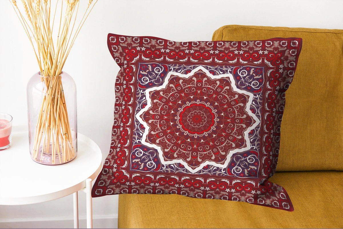 Bovenaanzicht van een roodbruin Perzisch tapijt met een symmetrisch mandala patroon.