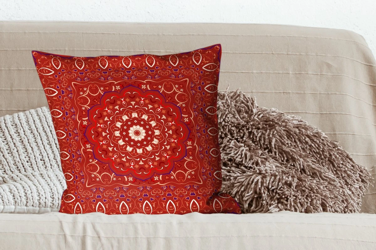 Bovenaanzicht van een roodbruin Perzisch tapijt met een symmetrisch mandala patroon.