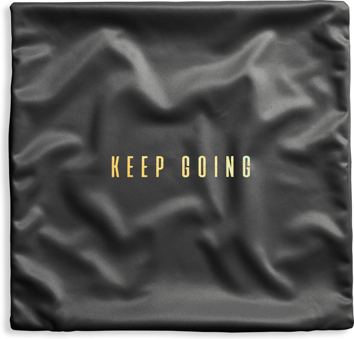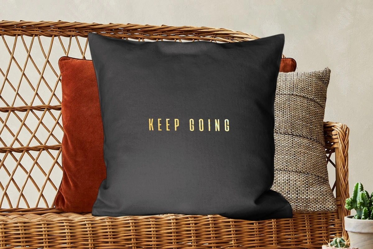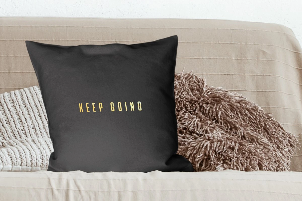Gouden quote ”keep going” op een zwarte achtergrond.