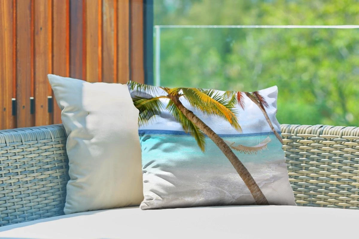 Een mooie afbeelding van een hangmat, die vast zit aan twee palmbomen. Aangevuld met uitzicht op het lichtblauwe water.