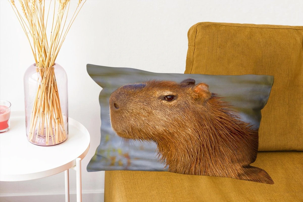 Een close up van het knaagdier Capibara die net uit het water komt en op het land gaat rusten.