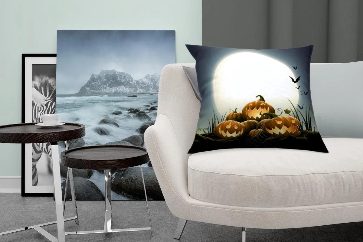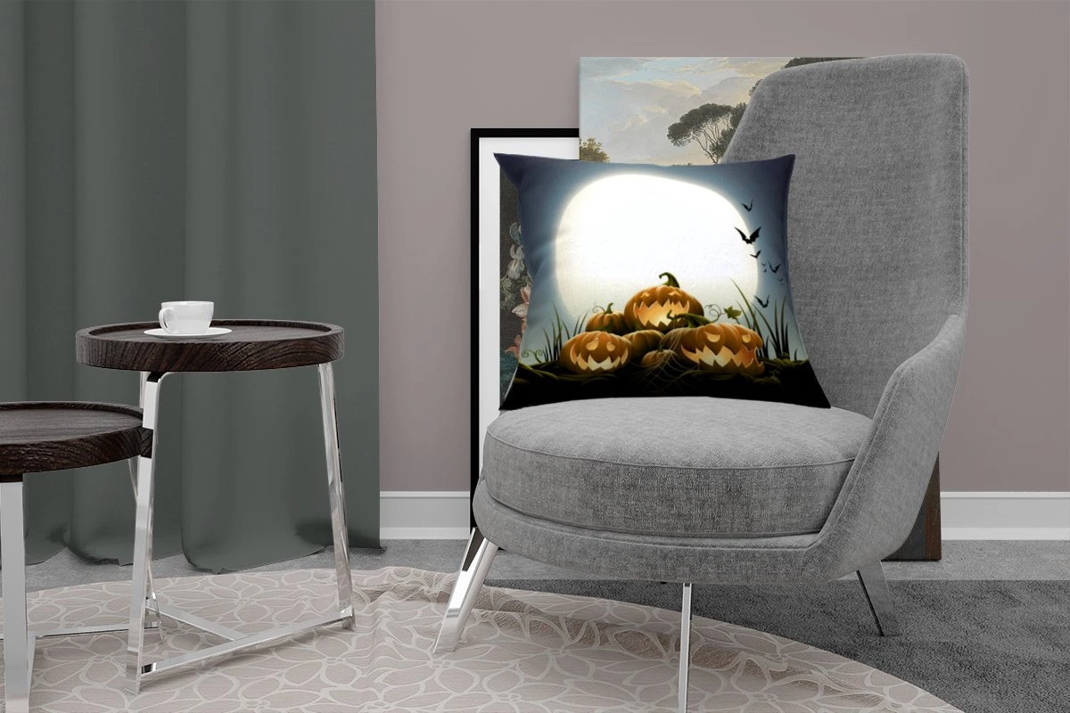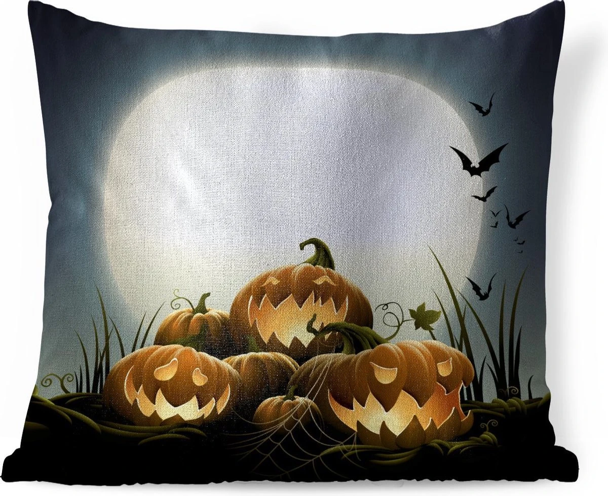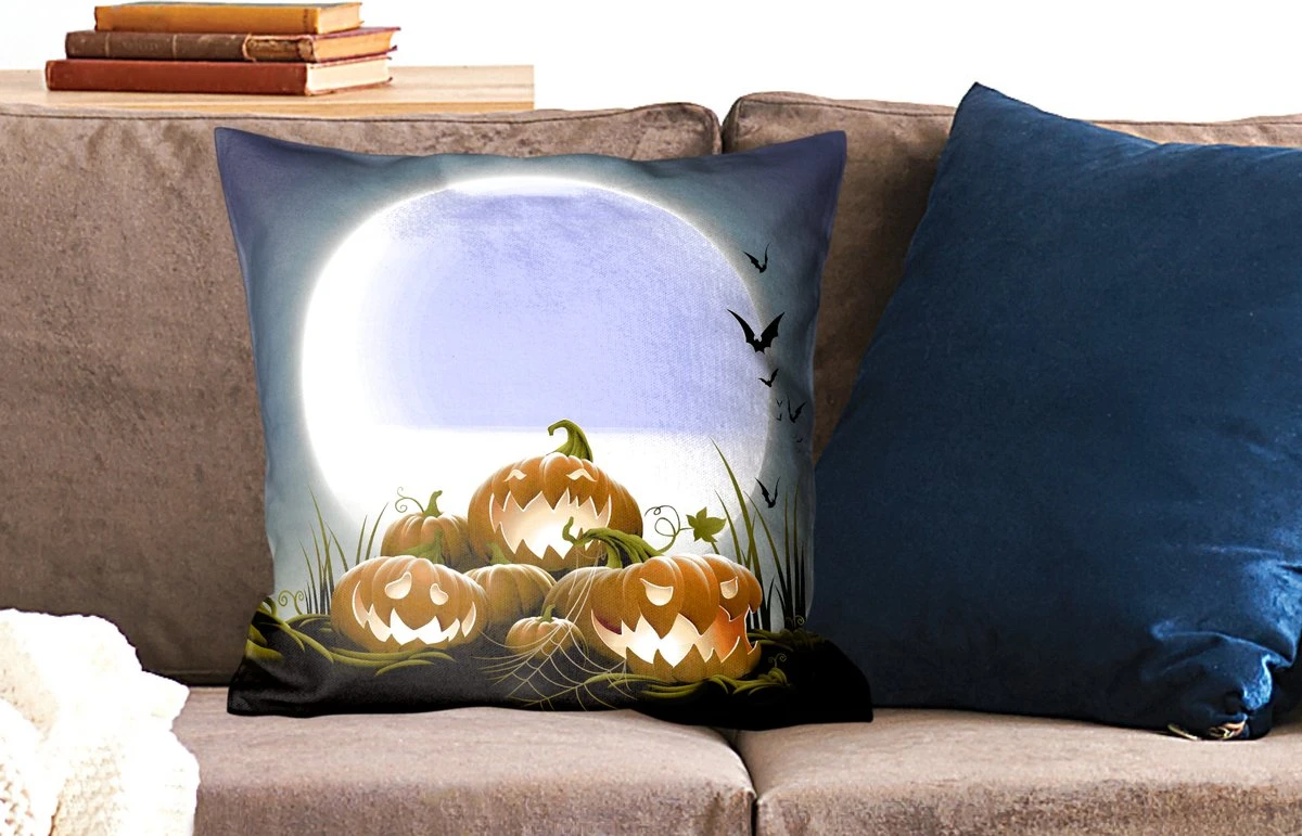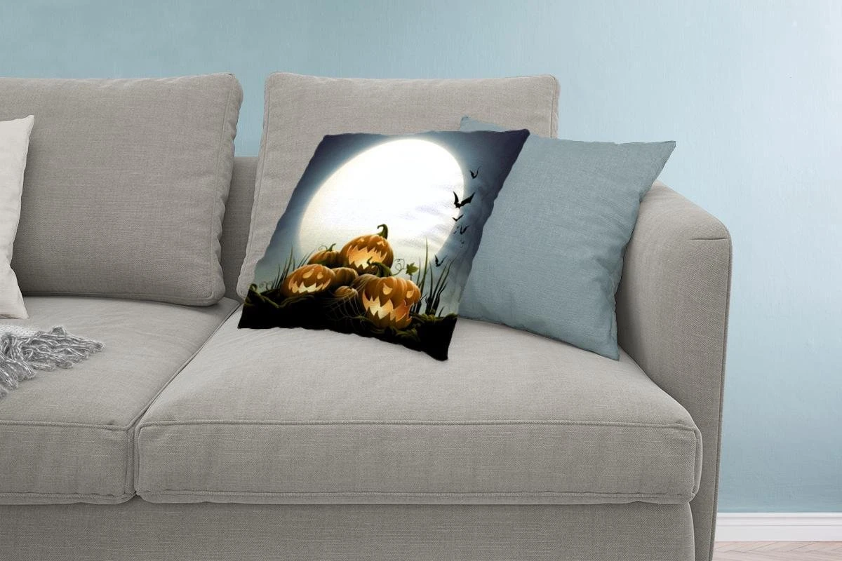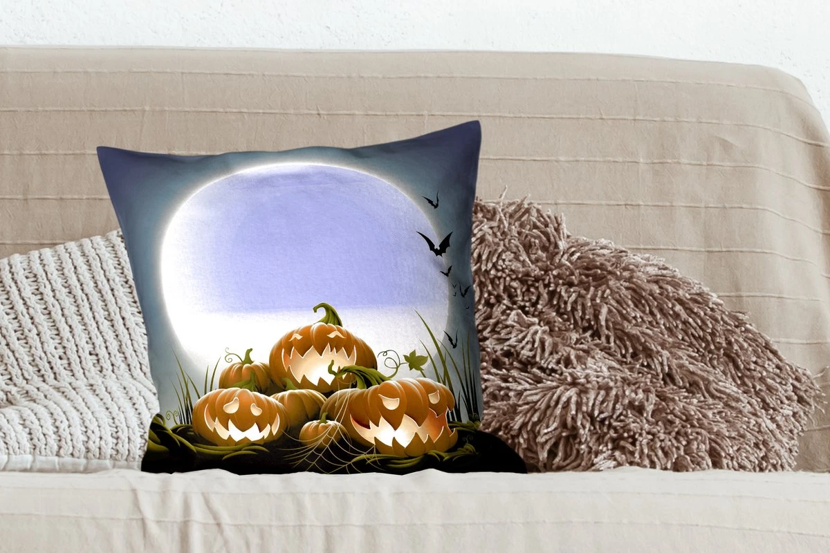 De volle maan belicht in een illustratie de lachende pompoenen. Deze groente staat symbool voor de Amerikaanse feestdag Halloween.