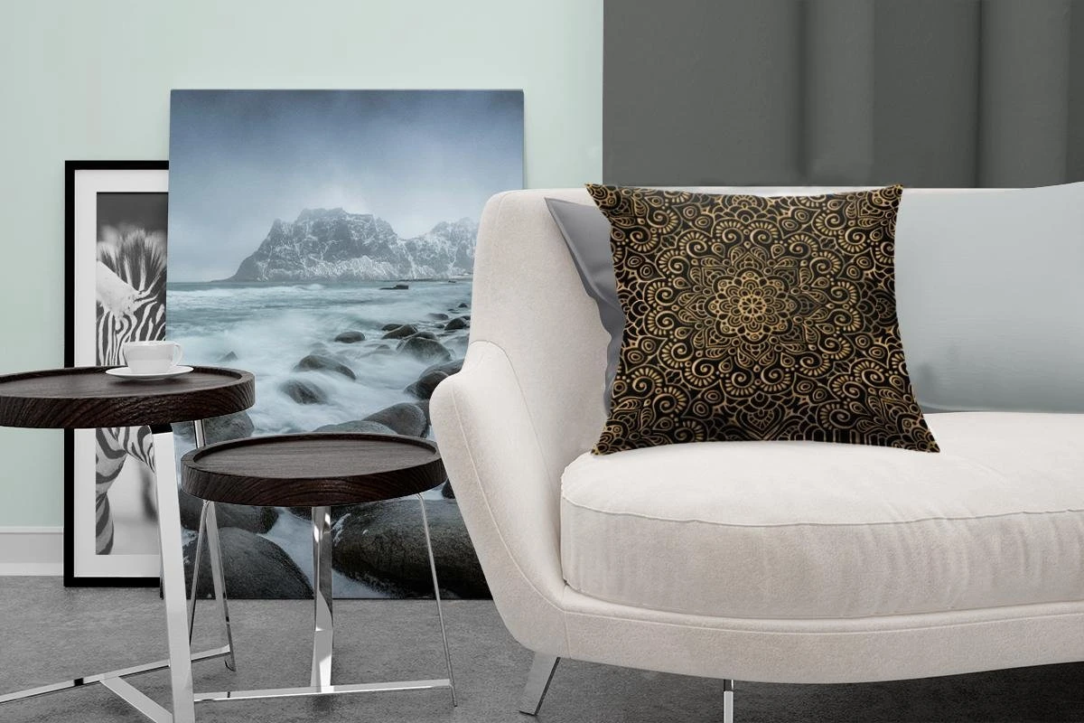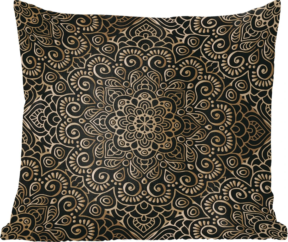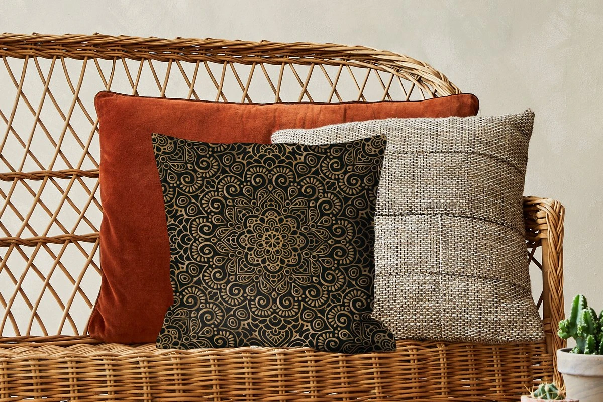 Een Indisch patroon vol sierlijke tekeningen en vormen is met gouden lijnen op een zwarte achtergrond gezet. Deze gedetailleerde illustratie geeft elke woonkamer een luxe uitstraling.