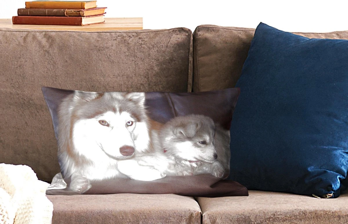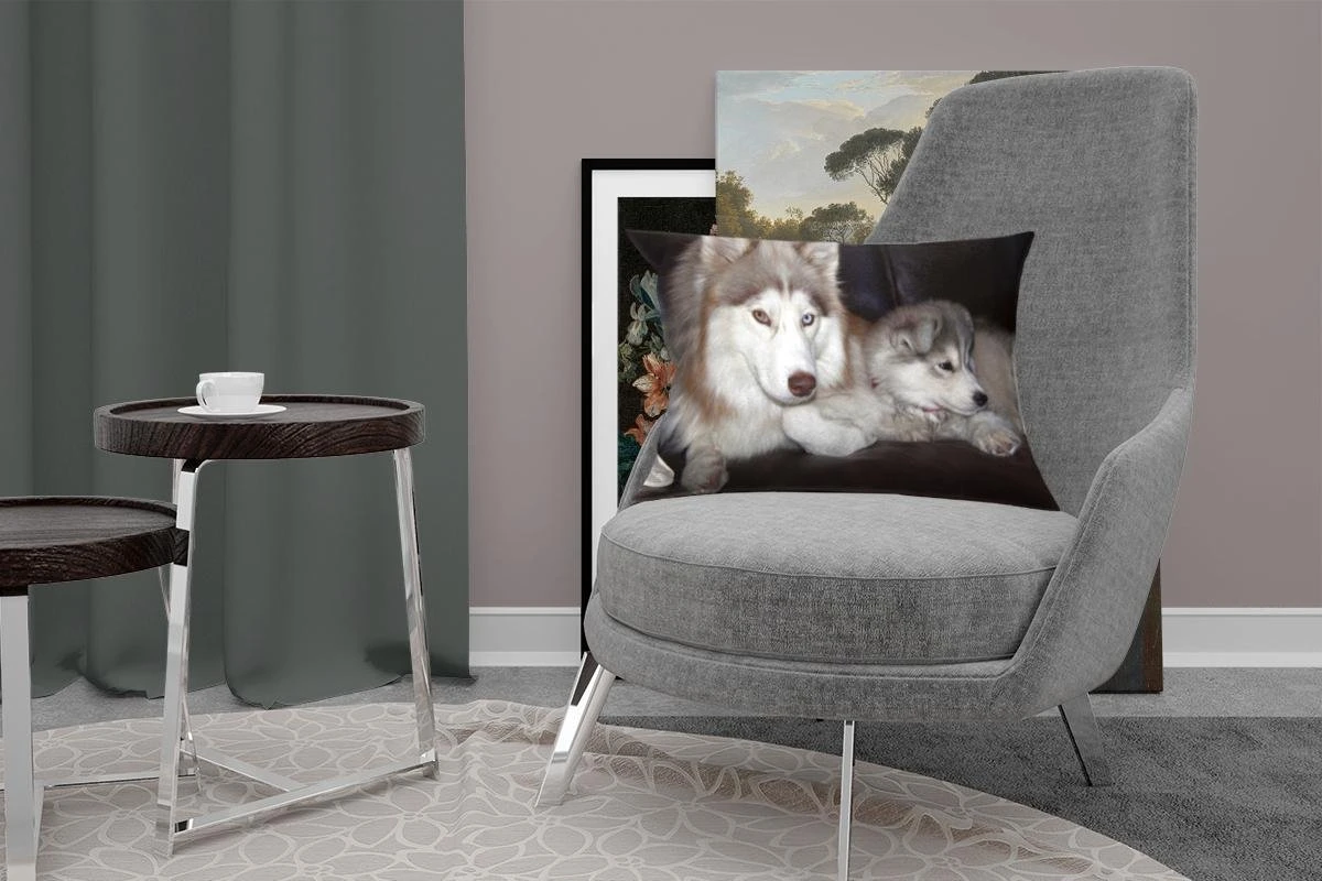 Een weergave van een grote hond die naast zijn kleine pup zit op de bank. Deze weergave komt goed tot zijn recht in de huiskamer.
