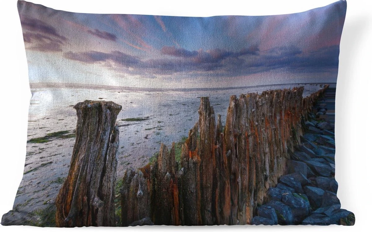 Bij een plaats genaamd Moddergat, staan een aantal palen in het water. In de blauwe lucht hangen een paar roze verlichte wolken. Verrijk het interieur van uw woonkamer met deze fantastische weergave.